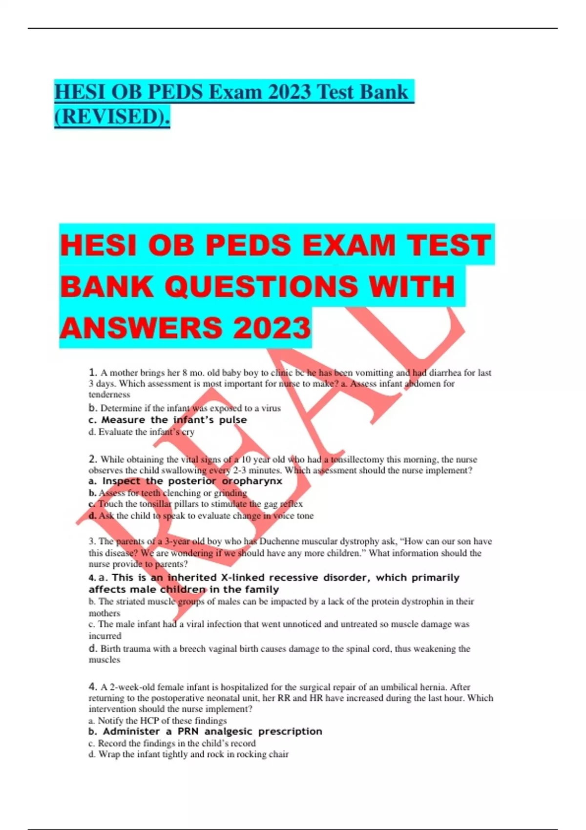 HESI OB PEDS Exam 2023 Test Bank (REVISED). HESI OB PEDS EXAM TEST BANK QUESTIONS WITH ANSWERS 2023 1. A mother brings her 8 mo. old baby boy to clinic bc he has been vomitting and had diarrhea for last 3 days. Which assessment is most important for nurse to make? a. Assess infant abdomen for tenderness b. Determine if the infant was exposed to a virus c. Measure the infant’s pulse d. Evaluate the infant’s cry 2. While obtaining the vital signs of a 10 year old who had a tonsillectomy this morning, the nurse observes the child swallowing every 2-3 minutes. Which assessment should the nurse implement? a. Inspect the posterior oropharynx b. Assess for teeth clenching or grinding c. Touch the tonsillar pillars to stimulate the gag reflex d. Ask the child to speak to evaluate change in voice tone 3. The parents of a 3-year old boy who has Duchenne muscular dystrophy ask, “How can our son have this disease? We are wondering if we should have any more children.” What information should the nurse provide to parents? 4. a. This is an inherited X-linked recessive disorder, which primarily affects male children in the family b. The striated muscle groups of males can be impacted by a lack of the protein dystrophin in their mothers c. The male infant had a viral infection that went unnoticed and untreated so muscle damage was incurred d. Birth trauma with a breech vaginal birth causes damage to the spinal cord, thus weakening the muscles 4. A 2-week-old female infant is hospitalized for the surgical repair of an umbilical hernia. After returning to the postoperative neonatal unit, her RR and HR have increased during the last hour. Which intervention should the nurse implement? a. Notify the HCP of these findings b. Administer a PRN analgesic prescription c. Record the findings in the child’s record d. Wrap the infant tightly and rock in rocking chair 5. A 2-year-old girl is brought to the clinic by her 17 year old mother. When the nurse observes that the child is drinking sweetened soda from her bottle, what information should the nurse discuss with this mother? a. A 2-year old should be speaking in 2 word phrases b. Dental caries are associated with drinking soda c. Drinking soda is related to childhood obesity d. Toddlers should be sleeping 10 hours a night e. Toddlers should be drinking from a cup by age 2 6. A mother brings her 3 month old infant to the clinic because the baby does not sleep through the night. Which finding is most significant in planning care for this family? a. The mother is a single parent and lives with her parents b. The mother states the baby is irritable during feedings c. The infant’s formula has been changed twice d. The diaper area shows severe skin breakdown 7. The nurse determines that an infant admitted for surgical repair of an inguinal hernia voids a urinary stream from the ventral surface of the penis. What action should the nurse take? a. Document the finding b. Palpate scrotum for testicular d