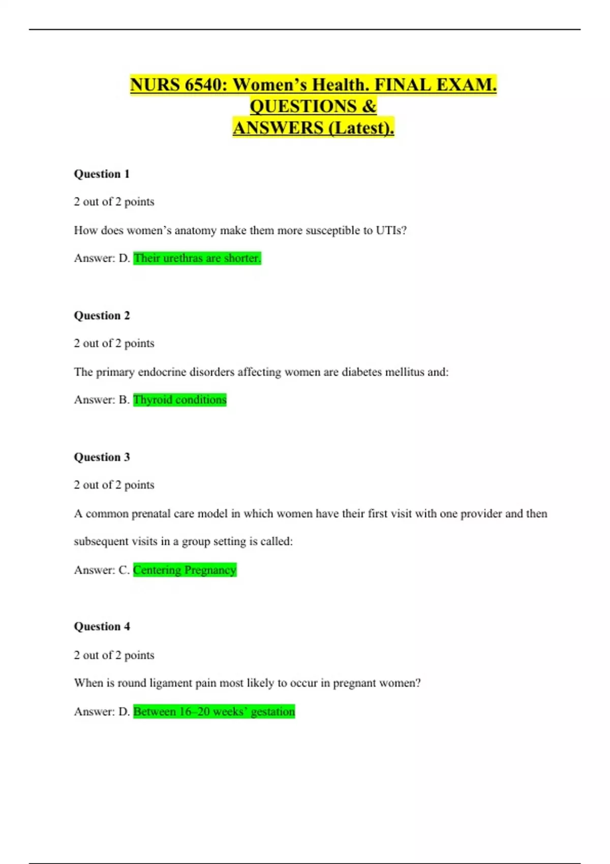 NURS 6540: Women’s Health. FINAL EXAM. QUESTIONS & ANSWERS (Latest). Question 1 2 out of 2 points How does women’s anatomy make them more susceptible to UTIs? Answer: D. Their urethras are shorter. Question 2 2 out of 2 points The primary endocrine disorders affecting women are diabetes mellitus and: Answer: B. Thyroid conditions Question 3 2 out of 2 points A common prenatal care model in which women have their first visit with one provider and then subsequent visits in a group setting is called: Answer: C. Centering Pregnancy