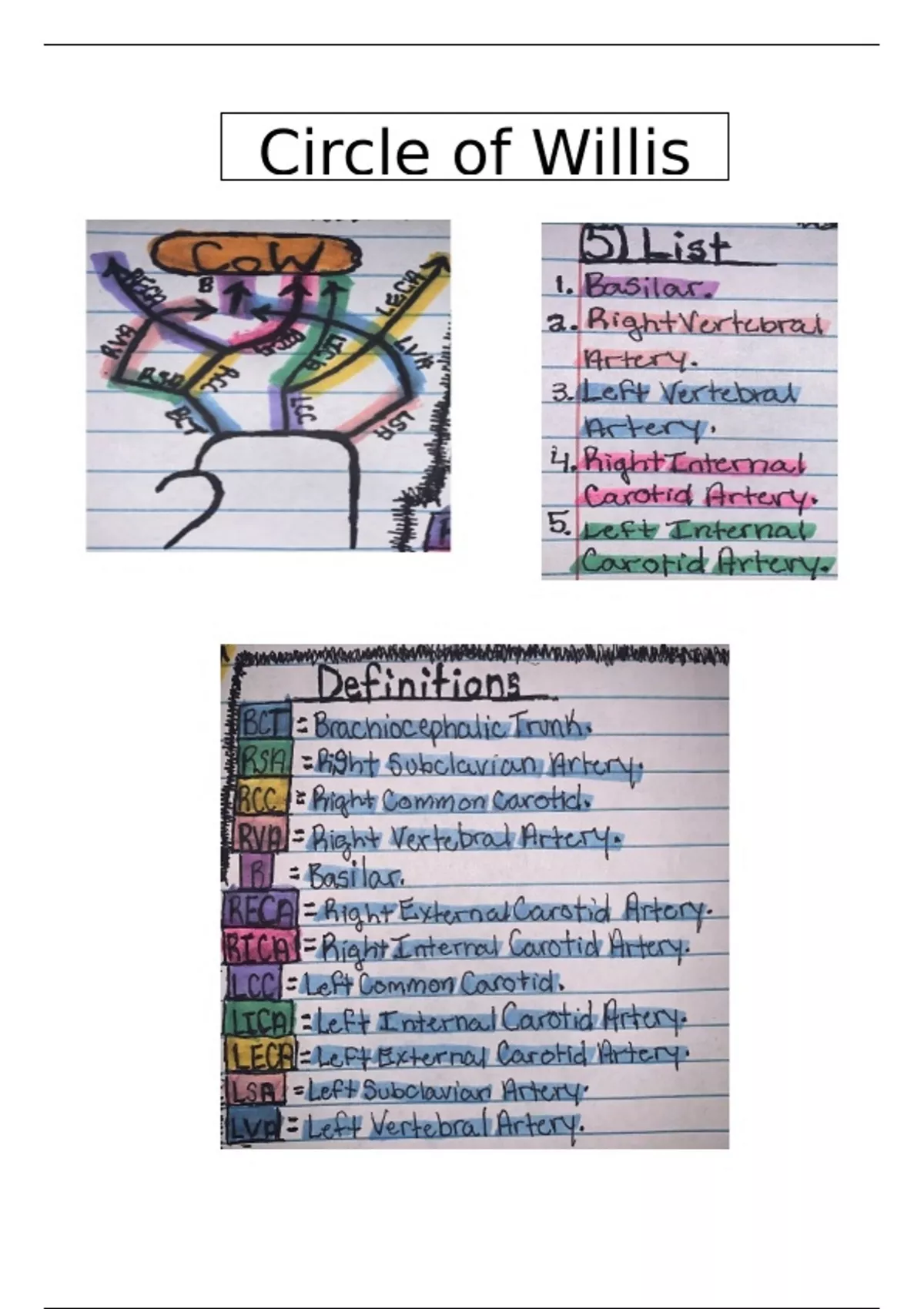 The circle of Willis encircles the stalk of the pituitary gland and provides important communications between the blood supply of the forebrain and hindbrain. In this Diagram, you will see the pathways extending from the Heart to the Brain. I have included a list of all the blood vessels the blood goes through. My Professor for my Anatomy and Physiology class (Dr. Meyer) drew this himself on the whiteboard, I just copied it. You will not find a diagram like this anywhere else!