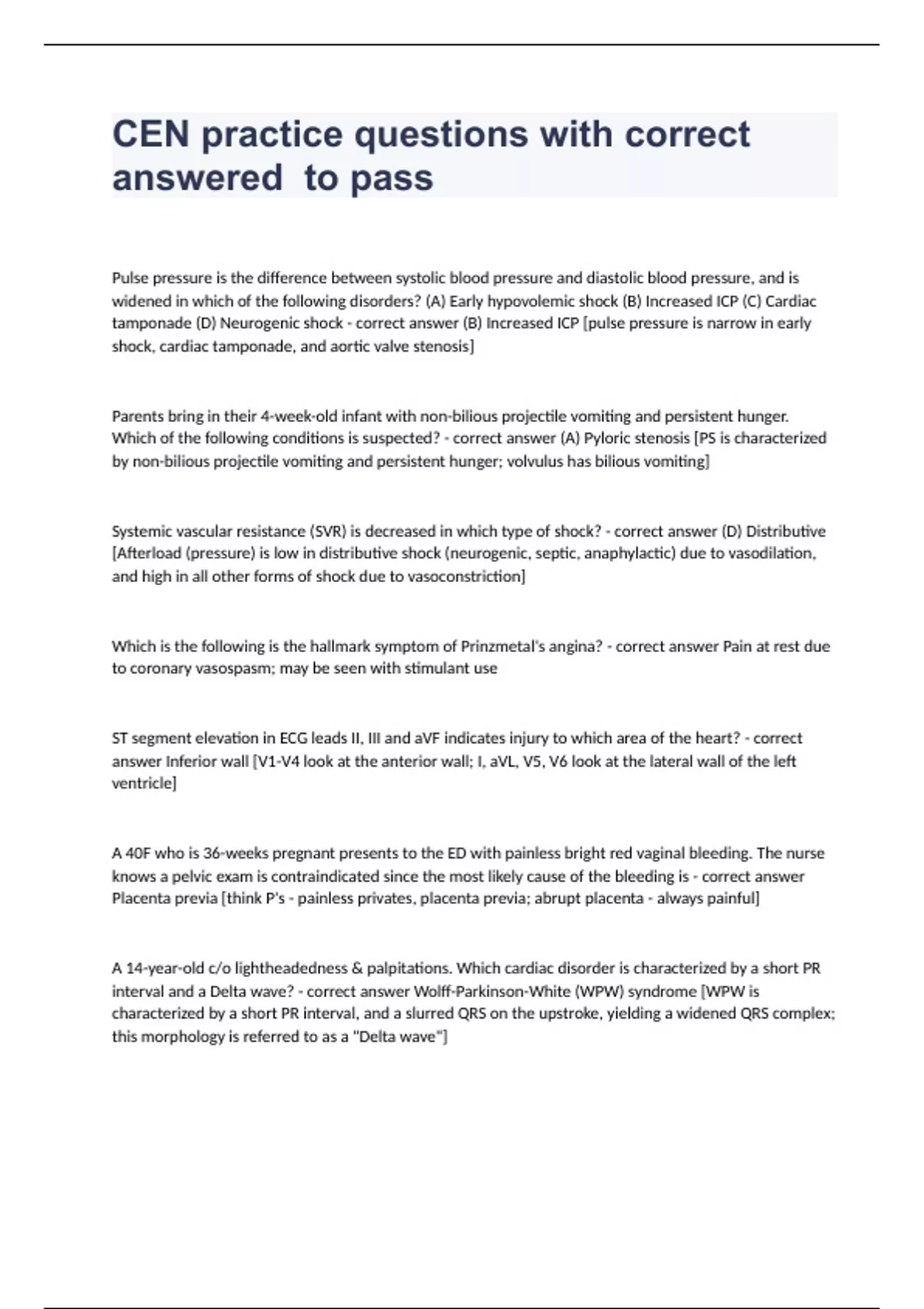 CEN practice questions with correct answered to passPulse pressure is the difference between systolic blood pressure and diastolic blood pressure, and is widened in which of the following disorders? (A) Early hypovolemic shock (B) Increased ICP (C) Cardiac tamponade (D) Neurogenic shock - correct answer (B) Increased ICP [pulse pressure is narrow in early shock, cardiac tamponade, and aortic valve stenosis] Parents bring in their 4-week-old infant with non-bilious projectile vomiting and persistent hunger. Which of the following conditions is suspected? - correct answer (A) Pyloric stenosis [PS is characterized by non-bilious projectile vomiting and persistent hunger; volvulus has bilious vomiting] Systemic vascular resistance (SVR) is decreased in which type of shock? - correct answer (D) Distributive [Afterload (pressure) is low in distributive shock (neurogenic, septic, anaphylactic) due to vasodilation, and high in all other forms of shock due to vasoconstriction] Which is the following is the hallmark symptom of Prinzmetal's angina? - correct answer Pain at rest due to coronary vasospasm; may be seen with stimulant use ST segment elevation in ECG leads II, III and aVF indicates injury to which area of the heart? - correct answer Inferior wall [V1-V4 look at the anterior wall; I, aVL, V5, V6 look at the lateral wall of the left ventricle] A 40F who is 36-weeks pregnant presents to the ED with painless bright red vaginal bleeding. The nurse knows a pelvic exam is contraindicated since the most likely cause of the bleeding is - correct answer Placenta previa [think P's - painless privates, placenta previa; abrupt placenta - always painful] A 14-year-old c/o lightheadedness & palpitations. Which cardiac disorder is characterized by a short PR interval and a Delta wave? - correct answer Wolff-Parkinson-White (WPW) syndrome [WPW is characterized by a short PR interval, and a slurred QRS on the upstroke, yielding a widened QRS complex; this morphology is referred to as a "Delta wave"] A 22F c/o thick, white, "cottage-cheese" like vaginal discharge, pruritus, vulvar burning and dyspareunia. The nurse suspects a diagnosis of: - correct answer Candidiasis [characterized by pruritus & thick, white, "cottage-cheese" like vaginal discharge] Which atrioventricular block is characterized by a consistent but prolonged PR interval, and a consistent R to R interval? - correct answer First degree AV block [Second degree type I has progressive elongation of PR interval; second degree type 2 has a consistent PR interval, but inconsistent R to R interval; third degree heart block has a consistent R to R interval, but the P waves get lost] Fever, bloating, and pain at the right costal margin upon palpation is associated with which disorder? - correct answer Cholecystitis [pain at the right costal margins = "Murphy's sign"] JVD, increased CVP, hepatomegaly, and peripheral edema is seen in which disorder? - correct answer Right heart failure [S&S = JVD, increased right atrial pressure (CVP), peripheral edema, ascites, hepatomegaly, and splenomegaly; left heart failure S&S = pulmonary edema] The following are signs of pericardial tamponade? - correct answer S&S: Beck's triad (hypotension, JVD, muffled heart sounds); the pressure on the heart also causes pulses paradoxus [decreased BP and pulse strength upon inspiration], and electrical alternans [low EKG amplitude] Which of the following is an early sign/symptom of left ventricular heart failure? - correct answer Paroxysmal nocturnal dyspnea & dyspnea [crackles, JVD, ascites, hepatomegaly, peripheral edema = right heart failure] Morphine is contraindicated in a right ventricular MI (RV MI) because of what drug action? - correct answer Morphine reduces preload [preload reducing agents like morphine Lasix [venodilator], and NTG are contraindicated in RV MI b/c they decrease preload] Which of the following signs/symptoms is not characteristic of Wernicke's encephalopathy? Confabulation, chronic memory loss, ataxia, nystagmus. - correct answer Chronic memory loss [Wernick's encephalopathy is characterized by confusion, confabulation, gait ataxia and nystagmus; chronic/permanent memory loss is a symptom of Korsakoff's syndrome] A patient c/o an excruciating unilateral headache with nasal congestion and excessive lacrimation on the affect side. The nurse suspects: - correct answer Cluster headache [excessive tearing/lacrimation, along with unilateral nasal congestion, are signs of a cluster HA; temporal (Giant cell) arteritis has a palpable cord-like temporal artery Which highly communicable infection is characterized by swollen salivary and parotid glands? - correct answer Mumps [Measles = Koplik spots; pertussis = "whooping cough"; diphtheria = gray pseudomembranous coating in throat] A 68F with a history of AFIB c/o sudden onset of painless, unilateral vision loss and denies any trauma. Which ocular emergency does the nurse suspect? - correct answer Central retinal artery occlusion (CRAO) [acute angle glaucoma = "tunnel vision" and halos around lights; hyphema = blood in anterior chamber of eye] Which of the following signs/symptoms should raise an index of suspicion that a patient is experiencing retinal detachment? - correct answer Photopsia and "floaters" in the visual field A hazardous vulnerability assessment is completed in which phase of disaster management? - correct answer Mitigation [disaster preparedness = stockpiling supplies, training and mutual aid agreements] A patient c/o sharp chest pain that worsens with inspiration and lying down. Which sound is commonly heard in pericarditis? - correct answer Pericardial friction rub, heard best when the patient leans forward [murmurs are audible in valve disorders] Pertussis is a highly communicable infection characterized by gagging, vomiting, and what hallmark sign? - correct answer Paroxysmal cough [inspiratory stridor = heard in upper airway obstruction, like croup; expiratory wheeze = heard early in lo