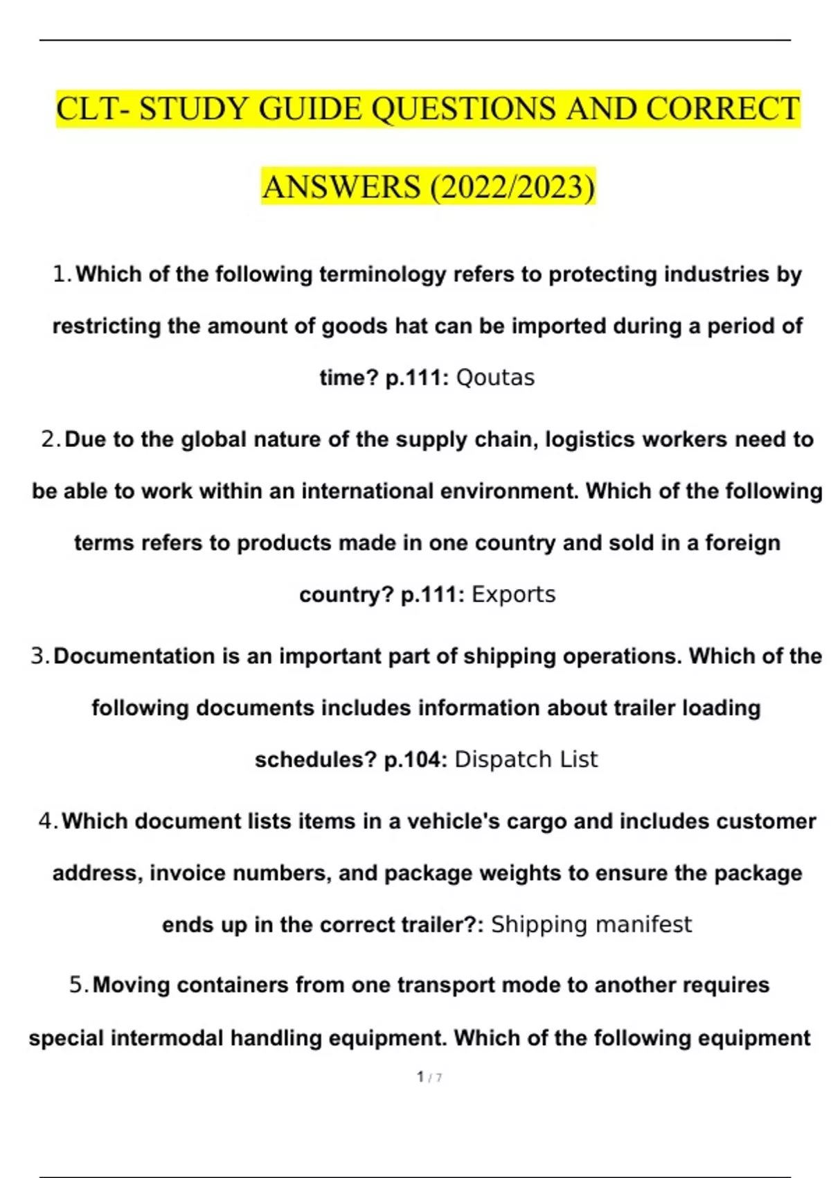 CLT STUDY GUIDE 2023 Questions and Answers (Verified Answers)