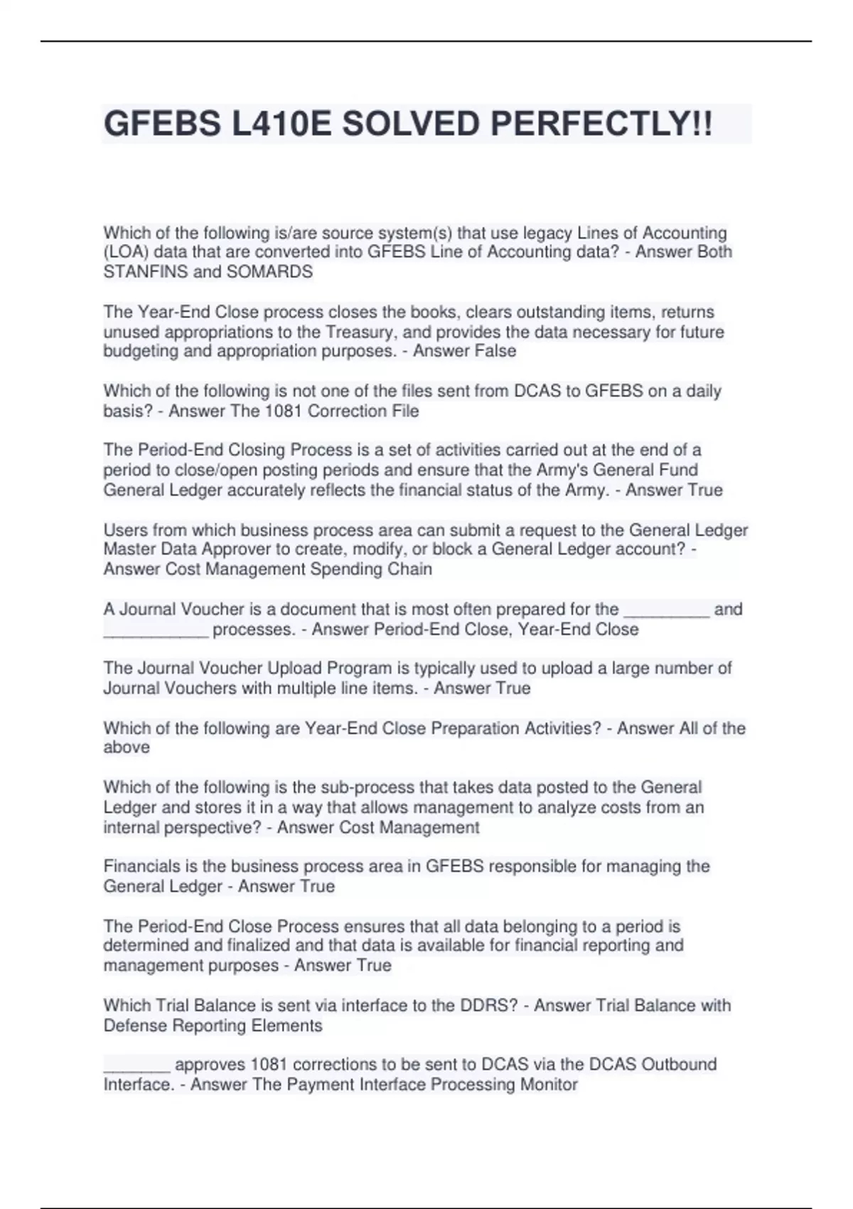Which of the following is/are source system(s) that use legacy Lines of Accounting (LOA) data that are converted into GFEBS Line of Accounting data? - Answer Both STANFINS and SOMARDS The Year-End Close process closes the books, clears outstanding items, returns unused appropriations to the Treasury, and provides the data necessary for future budgeting and appropriation purposes. - Answer False Which of the following is not one of the files sent from DCAS to GFEBS on a daily basis? - Answer The 1081 Correction File The Period-End Closing Process is a set of activities carried out at the end of a period to close/open posting periods and ensure that the Army's General Fund General Ledger accurately reflects the financial status of the Army. - Answer True Users from which business process area can submit a request to the General Ledger Master Data Approver to create, modify, or block a General Ledger account? - Answer Cost Management Spending Chain