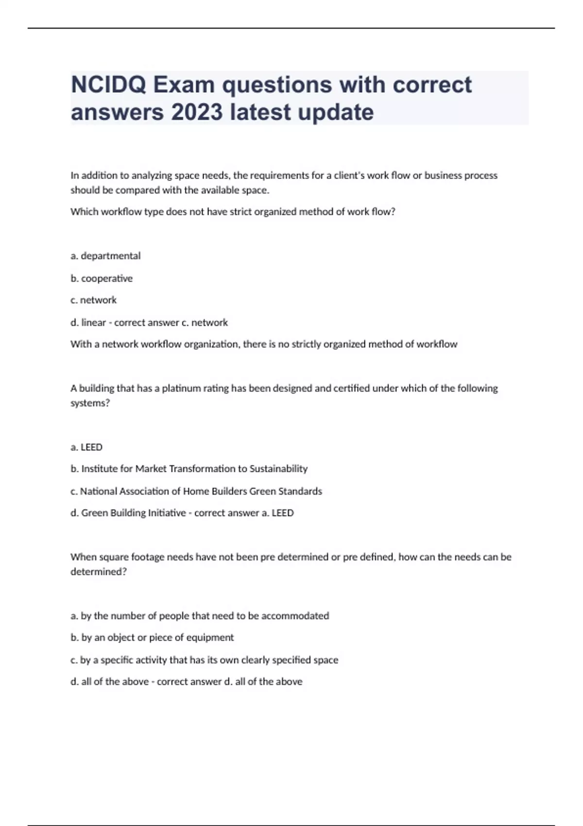 NCIDQ Exam questions with correct answers 2023 latest update In addition to analyzing space needs, the requirements for a client's work flow or business process should be compared with the available space. Which workflow type does not have strict organized method of work flow? a. departmental b. cooperative c. network d. linear - correct answer c. network With a network workflow organization, there is no strictly organized method of workflow A building that has a platinum rating has been designed and certified under which of the following systems? a. LEED b. Institute for Market Transformation to Sustainability c. National Association of Home Builders Green Standards d. Green Building Initiative - correct answer a. LEED When square footage needs have not been pre determined or pre defined, how can the needs can be determined? a. by the number of people that need to be accommodated b. by an object or piece of equipment c. by a specific activity that has its own clearly specified space d. all of the above - correct answer d. all of the above In which case would the number of people occupying a space NOT be critical to the programming effort? a. the dining room of a housing complex for the elderly b. the work room of a commercial laundry c. a multipurpose meeting room in a neighborhood rec center d. a waiting area in a hospital - correct answer b. workroom of commercial laundry The space in a laundry workroom would be determined more by the size, number, and configuration of equipment than by the limited number of people who would operate the equipment. Published articles have suggested that the benefits of diversity to a business can be much greater than ethical practice (fairness in hiring, etc.) or market access. However, these benefits relate directly to what main aspect of the organization? a. management practices inseparable from culture set in place by leadership. b. the number of diverse hirings made in response to marketplace drivers. c. hierarchical management that is critical of staff, productivity and creativity. d. counting employment statistics as evidence of equitable practices. - correct answer a. management practices inseparable from culture set in place by leadership Animal dander, pollen, and insects a. contribute to chemical contaminants from outdoor sources b. often do not irritate those occupants who suffer from allergies c. are three common biological contaminants often found in buildings d. all of the above - correct answer c. are three common biological contaminants often found in buildings Buildings constructed prior to which year are likely to contain spray-on fireproofing and insulation containing asbestos? a. 1970 b. 1987