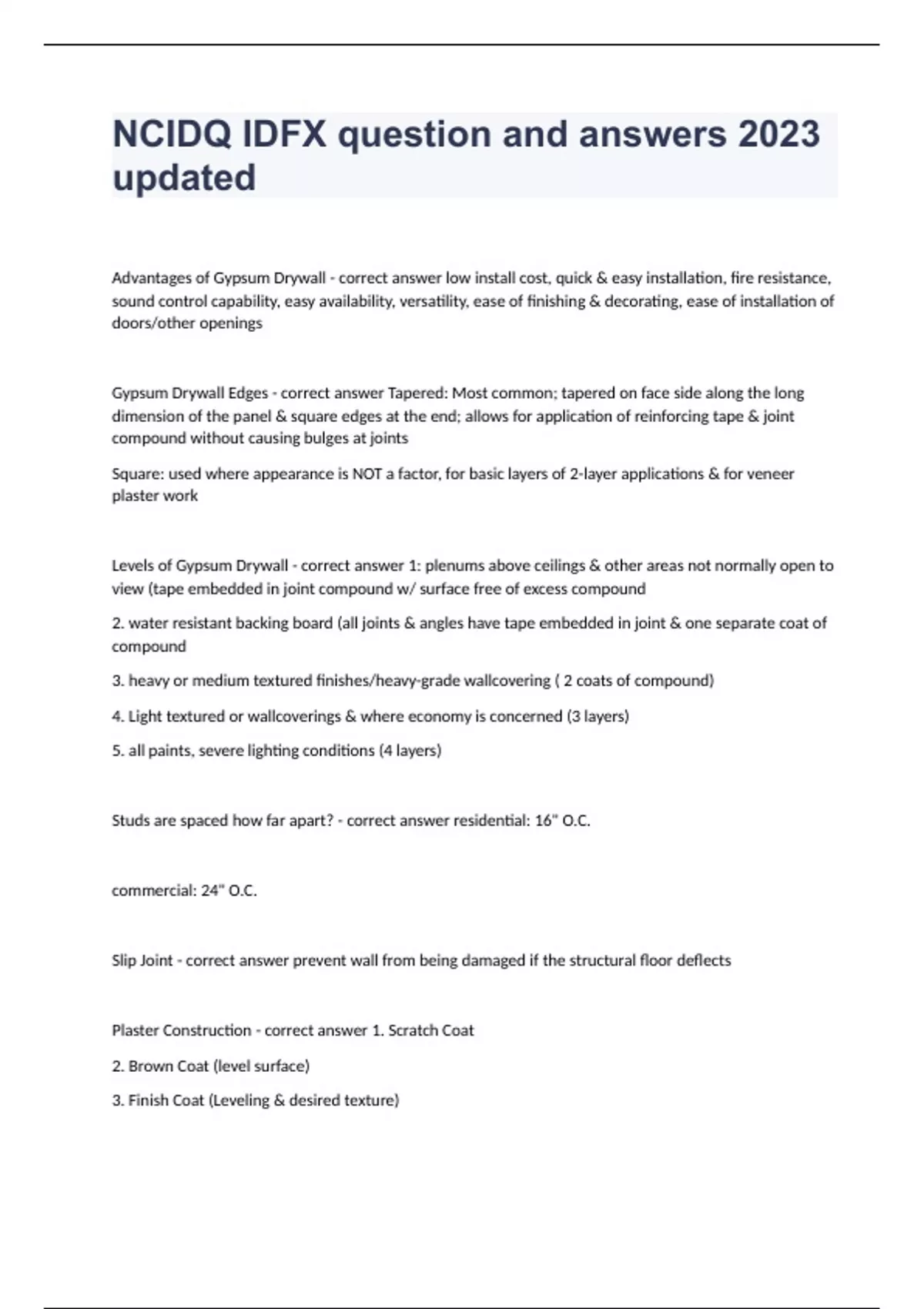 NCIDQ IDFX question and answers 2023 updated Advantages of Gypsum Drywall - correct answer low install cost, quick & easy installation, fire resistance, sound control capability, easy availability, versatility, ease of finishing & decorating, ease of installation of doors/other openings Gypsum Drywall Edges - correct answer Tapered: Most common; tapered on face side along the long dimension of the panel & square edges at the end; allows for application of reinforcing tape & joint compound without causing bulges at joints Square: used where appearance is NOT a factor, for basic layers of 2-layer applications & for veneer plaster work Levels of Gypsum Drywall - correct answer 1: plenums above ceilings & other areas not normally open to view (tape embedded in joint compound w/ surface free of excess compound 2. water resistant backing board (all joints & angles have tape embedded in joint & one separate coat of compound 3. heavy or medium textured finishes/heavy-grade wallcovering ( 2 coats of compound) 4. Light textured or wallcoverings & where economy is concerned (3 layers) 5. all paints, severe lighting conditions (4 layers) Studs are spaced how far apart? - correct answer residential: 16" O.C. commercial: 24" O.C. Slip Joint - correct answer prevent wall from being damaged if the structural floor deflects Plaster Construction - correct answer 1. Scratch Coat 2. Brown Coat (level surface) 3. Finish Coat (Leveling & desired texture) *Add Trim Masonry Block Dimensions - correct answer 8"x8"x16" (-3/8" for mortar joints) Demountable Partitions - correct answer Consists of a system of individual components that can be quickly assembled, disassembled & reused with nearly total salvageability consists of floor runners, ceiling runners, stud sections with clips to hold panels, & prefinished gyp. wallboard panels uses aluminum for framing Definition: Hinges - correct answer Consist of 2 leaves with an odd number of knuckles on one leaf and an even number of knuckles on the other knuckles are attached with a pin knuckle + pin = barrel (finished with tip) Types of Hinge Tips - correct answer -flat button (most common; typical) -hospital -oval head (typical) -steeple -flush Butt Hinge - correct answer MOST COMMON; has both leaves fully mortised into the frame and the edge of the door so the hinge is flush with the surface of the frame and door raised barrel hinge - correct answer used when there is not room for the barrel to extend past the door trim; OFFSET to allow one leaf to be mortised into the frame (kind of has an L shape on each side)