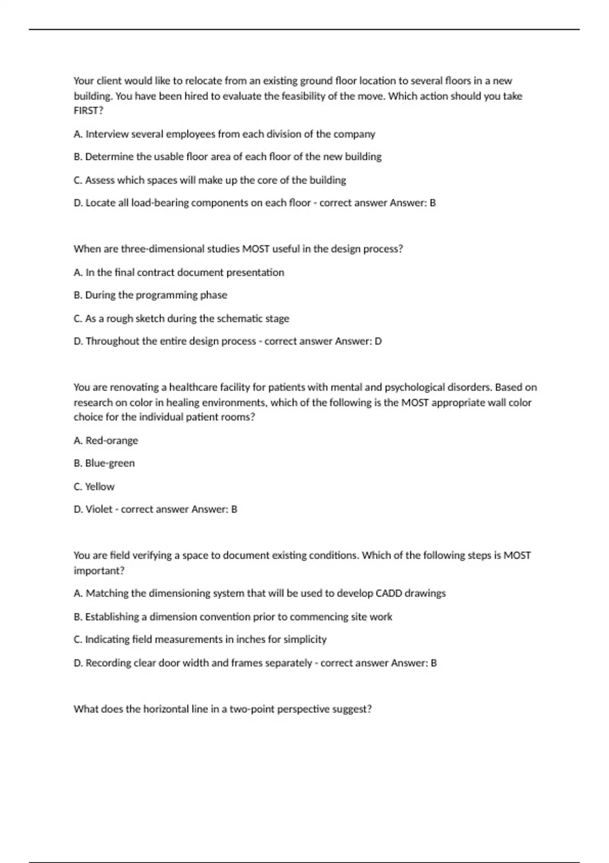NCIDQ Practice Exam Questions – IDFX question and answers 2023 What type of carpet construction has no separate primary backing? A. Knitted B. Woven C. Tufted D. Fusion Bonded - correct answer Answer: B What should you provide as part of a successful schematic presentation? A. Product specifications B. Written budget C. Rendered perspectives D. Design options - correct answer Answer: D At what stage would you conduct a building analysis for an existing multistory structure that is to be renovated and converted from office use to school use? A. Schematics B. Master planning C. Code analysis D. Programming - correct answer Answer: D When are you MOST likely to present a security desk plan and isometric sketch to a client? A. During the final programming presentation meeting with the client B. During the schematic design presentation meeting with the client C. At the design development client sign-off D. During shop drawing review - correct answer Answer: B Moisture-resistant gypsum board is MOST appropriate when installed: A. over vapor barriers. B. in humid and wet areas. C. in sprinklered spaces. D. in antibacterial spaces. - correct answer Answer: B Which documents are used to explain preliminary design recommendations and allow you to proceed to the design development phase of the project? A. Furniture layouts B. Millwork details C. Working drawings D. Adjacency diagrams - correct answer Answer: D You are increasing the door width from 3'-0" [900 mm] to 5'-0" [1500 mm]. What framing member should also increase in size? A. Beam B. Header C. Rail D. Jamb - correct answer Answer: B