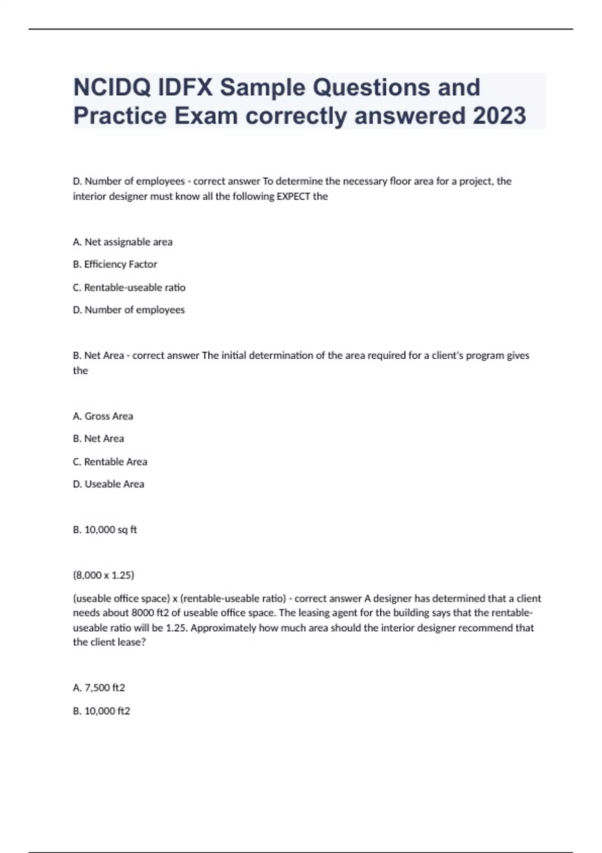 NCIDQ IDFX Sample Questions and Practice Exam correctly answered 2023D. Number of employees - correct answer To determine the necessary floor area for a project, the interior designer must know all the following EXPECT the A. Net assignable area B. Efficiency Factor C. Rentable-useable ratio D. Number of employees B. Net Area - correct answer The initial determination of the area required for a client's program gives the A. Gross Area B. Net Area C. Rentable Area D. Useable Area B. 10,000 sq ft (8,000 x 1.25) (useable office space) x (rentable-useable ratio) - correct answer A designer has determined that a client needs about 8000 ft2 of useable office space. The leasing agent for the building says that the rentable-useable ratio will be 1.25. Approximately how much area should the interior designer recommend that the client lease? A. 7,500 ft2 B. 10,000 ft2 C. 10,700 ft2 D. 13,300 ft2 B. Will restrooms be available to the customers? - correct answer An interior designer is conducting a programming interview with a client for a small clothing boutique. Which of the following questions is the LEAST important for the designer to ask? A. Which items are most frequently purchased on impulse? B. Will restrooms be available to the customers? C. What amount of merchandise will be on display? D. What is the relationship between the cash/wrap counter and the dressing rooms? D. Establish goals, collect and analyze facts, uncover and test concepts, determine needs. Everyone Can't Understand Dogs Senese - correct answer In the five-step programming process outlined by the book Problem Seeking, the fifth step is to state the problem. What is the order of the first four steps? A. Determine needs, collect and analyze facts, uncover and test concepts, establish goals. B. Collect and analyze facts, determine needs, establish goals, uncover and test concepts. C. Uncover and test concepts, establish goals, determine needs, collect analyze facts.