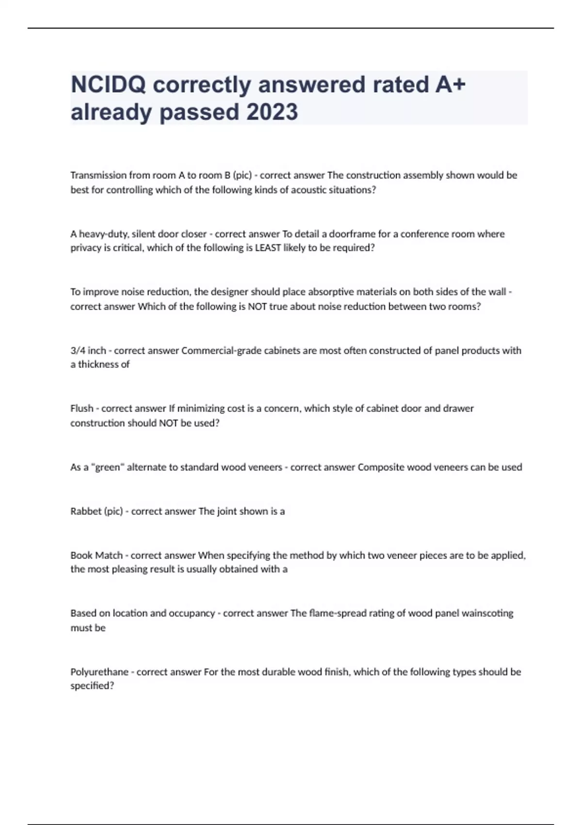 NCIDQ correctly answered rated A+ already passed 2023Transmission from room A to room B (pic) - correct answer The construction assembly shown would be best for controlling which of the following kinds of acoustic situations? A heavy-duty, silent door closer - correct answer To detail a doorframe for a conference room where privacy is critical, which of the following is LEAST likely to be required? To improve noise reduction, the designer should place absorptive materials on both sides of the wall - correct answer Which of the following is NOT true about noise reduction between two rooms? 3/4 inch - correct answer Commercial-grade cabinets are most often constructed of panel products with a thickness of Flush - correct answer If minimizing cost is a concern, which style of cabinet door and drawer construction should NOT be used? As a "green" alternate to standard wood veneers - correct answer Composite wood veneers can be used Rabbet (pic) - correct answer The joint shown is a Book Match - correct answer When specifying the method by which two veneer pieces are to be applied, the most pleasing result is usually obtained with a Based on location and occupancy - correct answer The flame-spread rating of wood panel wainscoting must be Polyurethane - correct answer For the most durable wood finish, which of the following types should be specified?