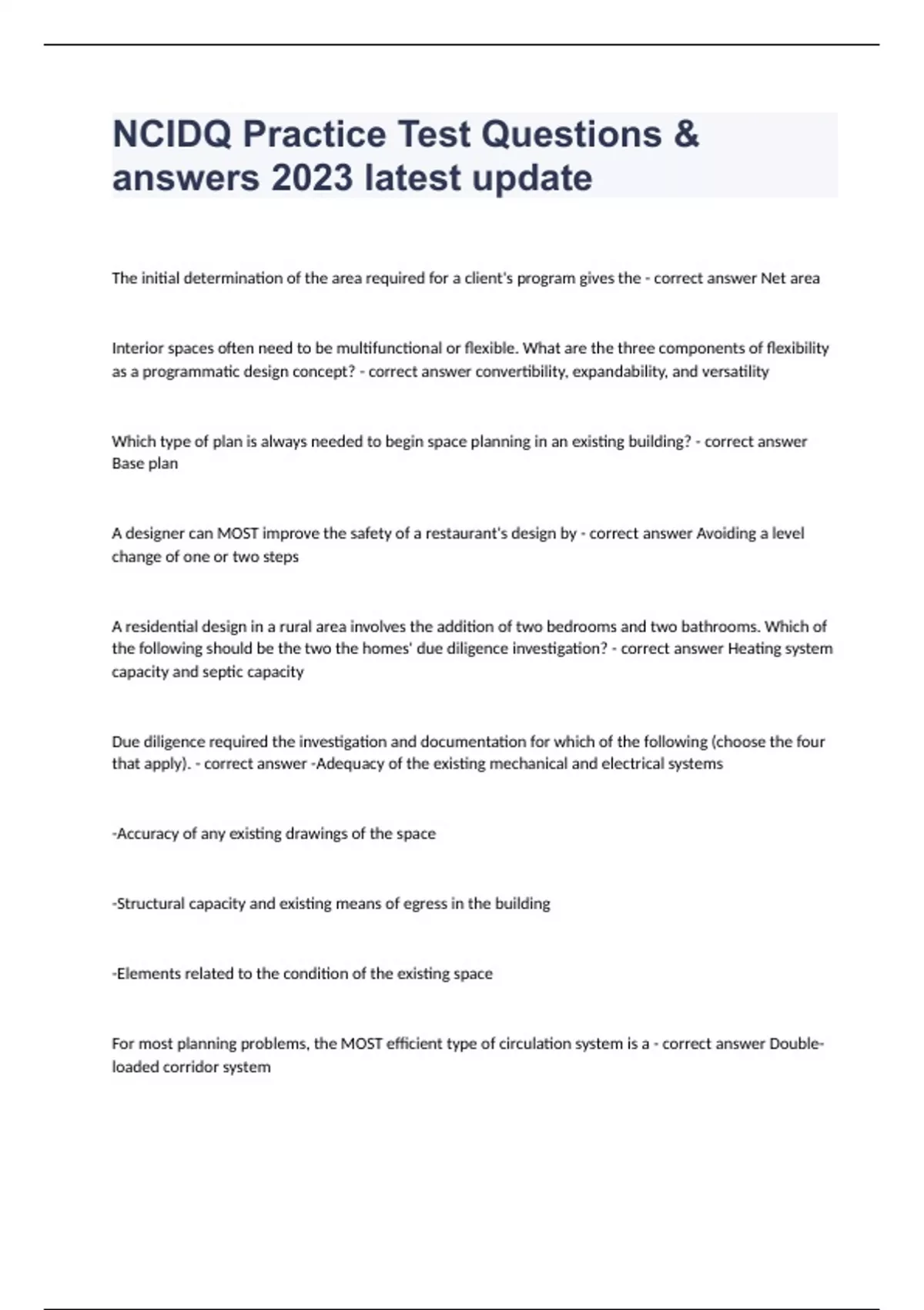 NCIDQ Practice Test Questions & answers 2023 latest updateThe initial determination of the area required for a client's program gives the - correct answer Net area Interior spaces often need to be multifunctional or flexible. What are the three components of flexibility as a programmatic design concept? - correct answer convertibility, expandability, and versatility Which type of plan is always needed to begin space planning in an existing building? - correct answer Base plan A designer can MOST improve the safety of a restaurant's design by - correct answer Avoiding a level change of one or two steps A residential design in a rural area involves the addition of two bedrooms and two bathrooms. Which of the following should be the two the homes' due diligence investigation? - correct answer Heating system capacity and septic capacity Due diligence required the investigation and documentation for which of the following (choose the four that apply). - correct answer -Adequacy of the existing mechanical and electrical systems -Accuracy of any existing drawings of the space -Structural capacity and existing means of egress in the building -Elements related to the condition of the existing space For most planning problems, the MOST efficient type of circulation system is a - correct answer Double-loaded corridor system To determine the necessary rentable floor area for a project, the interior designer must know which of the following? (choose the three that apply) - correct answer -Net assignable area -Efficiency factor -Rentable-usable ratio Which of the following data regarding a new multipurpose room in an assisted-living facility would be important for the interior designer to give to the mechanical engineer (choose the four that apply) - correct answer -Types of activities the room will be used for -Maximum number of residents using the room at one time -A copy of the reflected ceiling plan -Height of the ceiling According to William Pena's book, Problem Seeking, all design problems can be stated in terms of form and which three other factors? - correct answer Function, economy, and time Who is responsible for determining the condition of an existing floor as part of a due diligence investigation? - correct answer Interior designer An interior designer has been hired to redesign a large Victorian house into a bed and breakfast inn. During an initial interview, the client says that he wants to restore the interior to an authentic Victorian look, as well as enlarge some of the bedrooms into suites so that the inn will be the best in town. After hearing these comments, what should be the designer's FIRST action? - correct answer Ask the client if he has a budget, and suggest conducting a preliminary cost estimate to see if he can afford what he wants. The building commissioning of an interior design project seeking LEED credit is the responsibility of the - correct answer Independent commissioning team A new office suite is planned for the fifth floor of a building