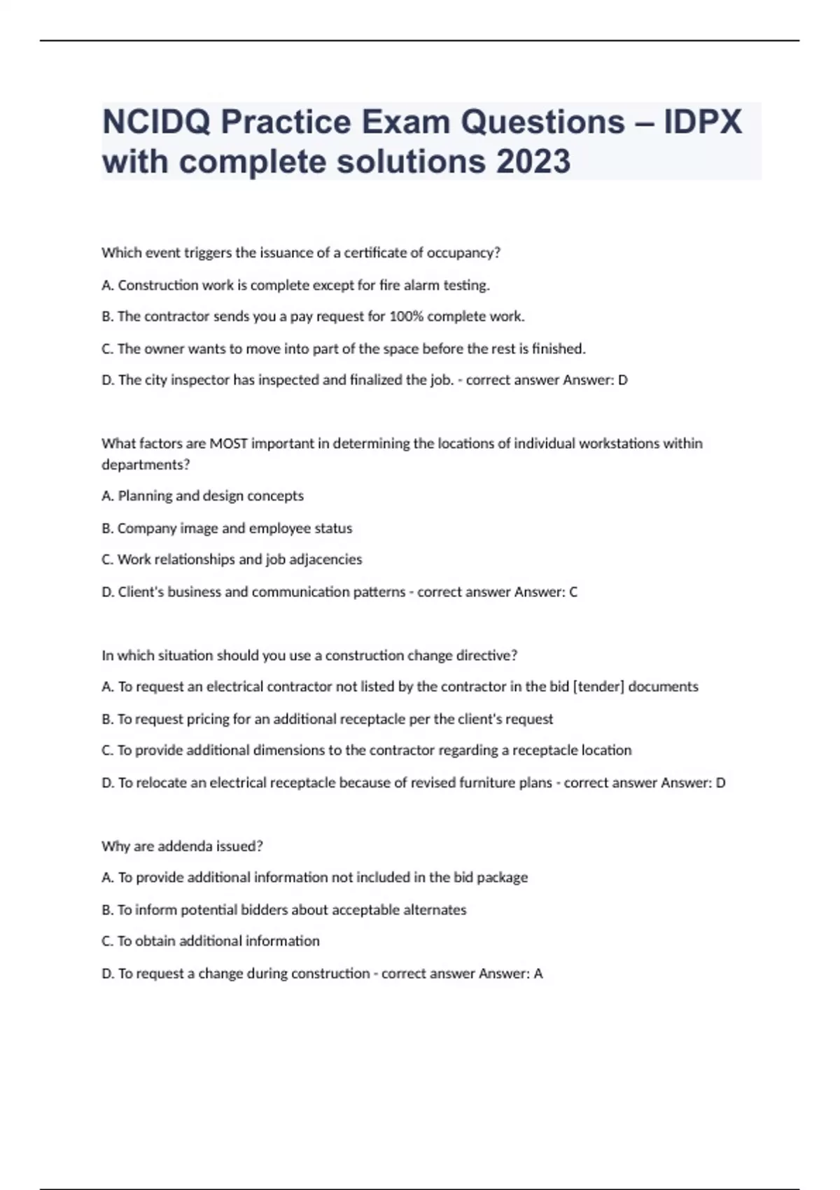 NCIDQ Practice Exam Questions – IDPX with complete solutions 2023Which event triggers the issuance of a certificate of occupancy? A. Construction work is complete except for fire alarm testing. B. The contractor sends you a pay request for 100% complete work. C. The owner wants to move into part of the space before the rest is finished. D. The city inspector has inspected and finalized the job. - correct answer Answer: D What factors are MOST important in determining the locations of individual workstations within departments? A. Planning and design concepts B. Company image and employee status C. Work relationships and job adjacencies D. Client's business and communication patterns - correct answer Answer: C In which situation should you use a construction change directive? A. To request an electrical contractor not listed by the contractor in the bid [tender] documents B. To request pricing for an additional receptacle per the client's request C. To provide additional dimensions to the contractor regarding a receptacle location D. To relocate an electrical receptacle because of revised furniture plans - correct answer Answer: D Why are addenda issued? A. To provide additional information not included in the bid package B. To inform potential bidders about acceptable alternates C. To obtain additional information D. To request a change during construction - correct answer Answer: A Which light and color characteristic would be MOST effective to enhance way-finding in a senior living facility? A. Brightness B. Hue C. Contrast D. Saturation - correct answer Answer: C What portion of a contract typically outlines the designer's responsibilities to the client? A. Scope of services B. Project description C. Terms and conditions D. Compensation schedule - correct answer Answer: A Your client has a very limited budget for design services, and the scope of the project warrants mechanical and electrical engineering specification. What should you do? A. Reduce your scope to reduce the fee, and contract with a mechanical/electrical engineer for an outline specification. B. Recommend that the client work with a contractor to provide design-build services for mechanical/electrical work. C. Request that the client contract directly with a mechanical/electrical engineer for limited services to review your drawings. D. Insist that your client increase the design budget to cover the necessary mechanical/electrical design services. - correct answer Answer: B Why is it necessary to indicate the placement of the proposed elevator and stairway in a preliminary plan? A. To ensure an acceptable location to meet all codes B. To verify the client's budget constraints C. To establish the structural support work required D. To ensure accessibility and visibility to visitors - correct answer Answer: A In which space is emergency lighting REQUIRED? A. Elevators B. Private offices C. Egress corridors D. Restrooms - correct answer Answer: C After construction on a project has begun, the client asks you to change the wallcovering originally specified to one that does not meet current code requirements. Which of the following is your BEST course of action? A. Research available products that are similar to the requested product and meet the code requirements. Present the options to the client for approval. B. Write a letter to the client stating that the change is against your professional recommendation and that you will make the change but assume no liability. C. Write a letter to the client explaining that you will not make the requested change. D. Tell the client that you will remove the wallcovering from the project and that the client may select and install a different product after your work is completed. - correct answer Answer: A How do you ensure that all signage on a construction project will be installed in the correct locations? A. Plan to be on site during installation of the signage, and specify where each sign will be placed. B. Require the signage vendor to provide detailed specifications. C. Provide a detailed takeoff along with a floor plan for installation. D. Schedule a meeting for the client or building owner to specify where signage will be placed. - correct answer Answer: C What aspect of working drawings can lead to problems during construction? A. Proprietary finishes B. Too much information C. Too many sheets of details D. Duplicated details - correct answer Answer: D Which of the following has the GREATEST impact on the effectiveness of an HVAC system?