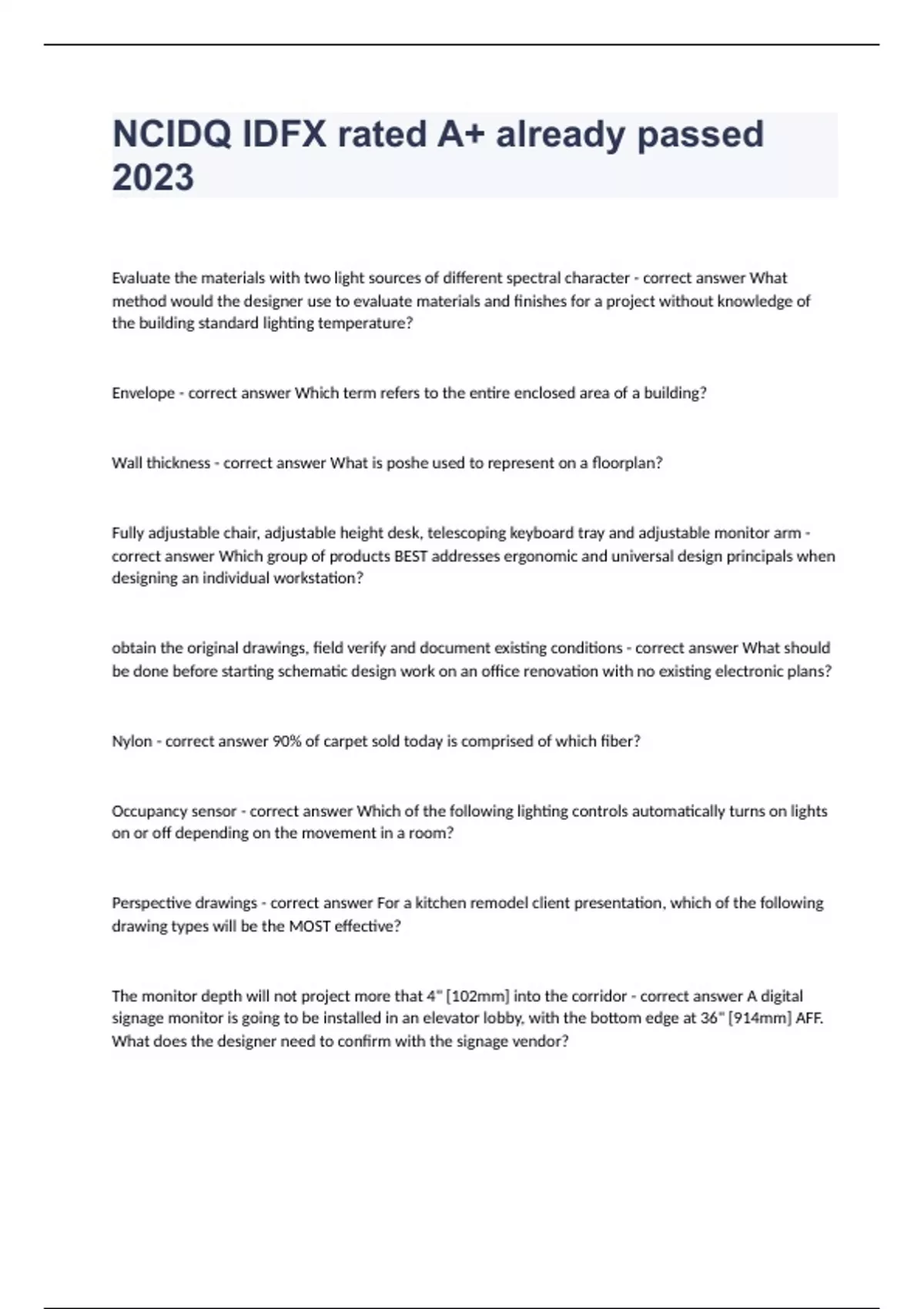 NCIDQ IDFX rated A+ already passed 2023 Evaluate the materials with two light sources of different spectral character - correct answer What method would the designer use to evaluate materials and finishes for a project without knowledge of the building standard lighting temperature? Envelope - correct answer Which term refers to the entire enclosed area of a building? Wall thickness - correct answer What is poshe used to represent on a floorplan? Fully adjustable chair, adjustable height desk, telescoping keyboard tray and adjustable monitor arm - correct answer Which group of products BEST addresses ergonomic and universal design principals when designing an individual workstation? obtain the original drawings, field verify and document existing conditions - correct answer What should be done before starting schematic design work on an office renovation with no existing electronic plans? Nylon - correct answer 90% of carpet sold today is comprised of which fiber? Occupancy sensor - correct answer Which of the following lighting controls automatically turns on lights on or off depending on the movement in a room? Perspective drawings - correct answer For a kitchen remodel client presentation, which of the following drawing types will be the MOST effective? The monitor depth will not project more that 4" [102mm] into the corridor - correct answer A digital signage monitor is going to be installed in an elevator lobby, with the bottom edge at 36" [914mm] AFF. What does the designer need to confirm with the signage vendor? Design Development - correct answer During which design phase would an interior designer start an outline specification? Concert hall - correct answer Which of the project types below would MOST require an acoustical designer? To illustrate finishes and millwork design - correct answer Why is it important to include interior elevations as part of the construction documents? Reflected ceiling plan - correct answer A designer specified three (3) pendant light fixtures over a dining table. Where are installation locations and distances between fixtures indicated? Handrail height - correct answer When dimensioning a stair section that must be called out to make sure the stair is build to code? Floor plan - correct answer When a construction project is completed in phases, where does an interior designer identify the limits of the project scope for each phase? Solid core wood door - correct answer Which door type could be considered a rated door? Redline - correct answer What is the process called when drawings are marked up, before or during construction, to show where problems exist? Field-measure all spaces and create as-built (record) drawings - correct answer An interior Designer is beginning a project in a building without current drawings. What are the NEXT steps? In the submittal requirements of the specifications. - correct answer The client has requested to see a mock-up of the wood paneling for the boardroom. Where should the designer indicate the requirement? incandescent lamp - correct answer In terms of occupant health, which of the following lamp types is BEST for use in the bedroom?
