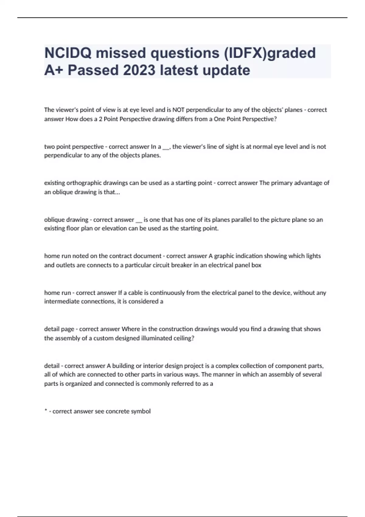 NCIDQ missed questions (IDFX)graded A+ Passed 2023 latest updateThe viewer's point of view is at eye level and is NOT perpendicular to any of the objects' planes - correct answer How does a 2 Point Perspective drawing differs from a One Point Perspective? two point perspective - correct answer In a __, the viewer's line of sight is at normal eye level and is not perpendicular to any of the objects planes. existing orthographic drawings can be used as a starting point - correct answer The primary advantage of an oblique drawing is that... oblique drawing - correct answer __ is one that has one of its planes parallel to the picture plane so an existing floor plan or elevation can be used as the starting point. home run noted on the contract document - correct answer A graphic indication showing which lights and outlets are connects to a particular circuit breaker in an electrical panel box home run - correct answer If a cable is continuously from the electrical panel to the device, without any intermediate connections, it is considered a detail page - correct answer Where in the construction drawings would you find a drawing that shows the assembly of a custom designed illuminated ceiling? detail - correct answer A building or interior design project is a complex collection of component parts, all of which are connected to other parts in various ways. The manner in which an assembly of several parts is organized and connected is commonly referred to as a * - correct answer see concrete symbol base bid specification - correct answer Your client has an account for special pricing with a particular manufacturer. However, they are unsure if the product they are getting is the best price they can receive for the same level of product. What type of specification would be best to include in the bid documents to ensure your client's concerns are addressed? base bid - correct answer spec is a type of prescriptive spec and basically an expanded proprietary spec, it ensures the designer truly understands the differences as well as the concerns of the client. 3 purposes of a detail - correct answer The first purpose is basic; they are simply a way of fitting the large components together. In this role, details resolve problems of connection and transition. The second purpose is to solve functional problems. The third purpose is to enhance the intent of the overall design concept. design concept - correct answer The color palette used is part of the overall idea of how the designer will approach meeting those functional needs through... linear workflow - correct answer the work or business process proceeds from one location to another in a strict sequence. centralized workflow - correct answer the work is controlled from one central position. departmental workflow - correct answer is hierarchical, typically with one group controlling work divided into separate departments. sick building syndrome - correct answer If an occupant of a building is experiencing a variety of health-related symptoms that cannot be directly linked to a particular cause, what might they be suffering from?