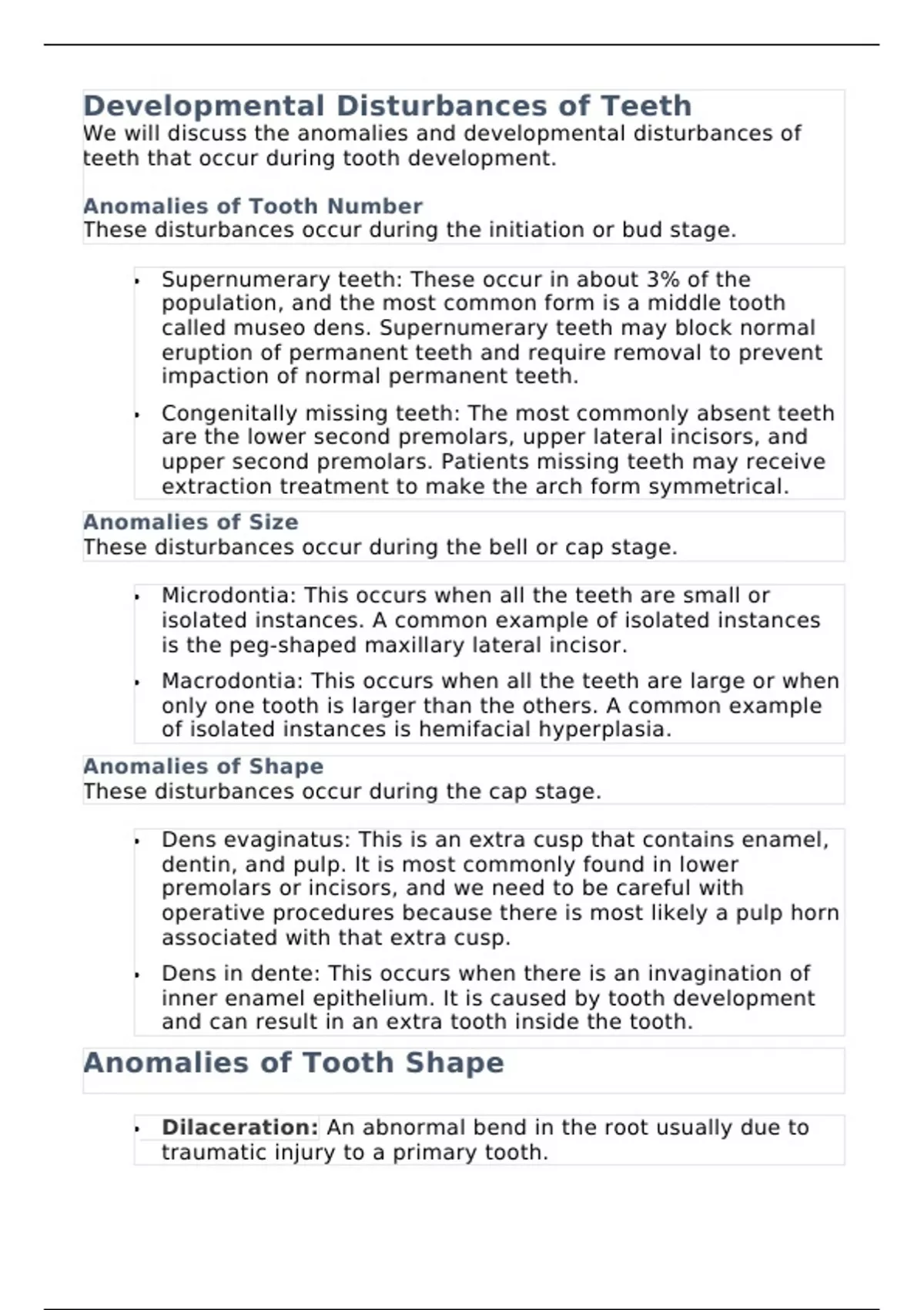 The development of teeth is a complex process that occurs in stages, starting from the early formation of tooth buds to the eruption of fully developed teeth. However, sometimes, developmental disturbances can occur, resulting in anomalies in dental growth and formation. Here is a brief description of developmental disturbances of teeth: Tooth Hypoplasia: Tooth hypoplasia refers to the incomplete or defective development of tooth enamel. It can manifest as white or brown spots, grooves, or pits on the tooth surface. Factors such as malnutrition, illness, trauma, or certain medications during tooth development can contribute to this condition. Tooth hypoplasia can make affected teeth more prone to tooth decay and sensitivity. Tooth Agenesis: Tooth agenesis is the absence of one or more permanent teeth. It can occur due to genetic factors or as part of a syndrome. The most commonly missing teeth are the third molars (wisdom teeth), followed by the second premolars and upper lateral incisors. Tooth agenesis may lead to alignment issues and impact the functionality and aesthetics of the dentition. Supernumerary Teeth: Supernumerary teeth are extra teeth that exceed the normal dentition count. They can appear in any area of the mouth and may cause overcrowding, misalignment, or impede the eruption of permanent teeth. Supernumerary teeth can occur as isolated cases or be associated with genetic conditions. Tooth Eruption Disturbances: Tooth eruption disturbances involve delays or deviations from the normal eruption pattern of teeth. Teeth may erupt earlier or later than expected or may erupt in abnormal positions. Factors such as genetics, crowding, and oral habits (thumb sucking, tongue thrusting) can influence eruption disturbances. Orthodontic intervention may be required to address alignment issues caused by eruption disturbances. Enamel Defects: Enamel defects refer to structural abnormalities in the tooth enamel. These defects can manifest as discoloration, pitting, or enamel hypoplasia. Enamel defects can result from genetic factors, nutritional deficiencies, certain medications, or systemic conditions during tooth development. They can make teeth more susceptible to decay and require appropriate dental care and treatment. Dens in Dente: Dens in dente, also known as "tooth within a tooth," is a developmental anomaly where a deep invagination occurs within the tooth during its formation. This invagination can trap bacteria and debris, leading to an increased risk of tooth decay or infection. Understanding developmental disturbances of teeth is important for early detection and appropriate management. Regular dental check-ups, early orthodontic evaluation, and timely intervention can help address these issues, promote proper dental development, and maintain optimal oral health. If you suspect any developmental disturbances or have concerns about your child's dental development, consult with a dentist or a pediatric dentist for a thorough examination and guidance on necessary treatments or interventions