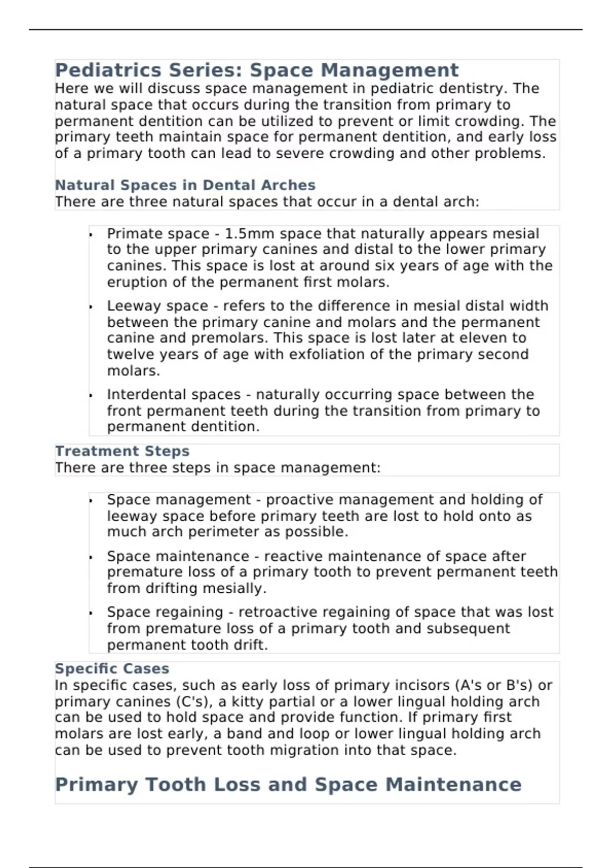 Space Management: Guiding Proper Tooth Alignment and Development Space management in dentistry refers to the techniques and strategies employed to ensure adequate space for the eruption and alignment of permanent teeth. It is a critical aspect of pediatric dentistry and orthodontics, aimed at guiding the natural growth and development of a child's dentition. Here is a brief description of space management: Primary Dentition: During the primary dentition phase, the primary teeth serve as placeholders for the permanent teeth. The primary teeth help in chewing, speech development, and maintaining the space necessary for the proper eruption of permanent teeth. If a primary tooth is lost prematurely due to decay or injury, space management techniques, such as the use of space maintainers, may be employed to prevent adjacent teeth from shifting into the vacant space and potentially causing orthodontic issues. Space Maintainers: Space maintainers are devices used to hold the space created by a prematurely lost primary tooth. They are typically custom-made appliances made of metal or acrylic and can be fixed or removable. Space maintainers prevent neighboring teeth from drifting into the space and maintain the appropriate alignment for the eruption of permanent teeth. By preserving the space, space maintainers help minimize the need for orthodontic treatment later in life. Orthodontic Intervention: In some cases, space management may involve orthodontic intervention to address dental alignment issues and create adequate space for permanent teeth. Orthodontic treatments, such as braces or aligners, can guide the growth and alignment of the teeth, ensuring that there is enough space for the eruption of permanent teeth in their correct positions. Early orthodontic evaluation allows for timely intervention and appropriate space management, reducing the complexity of orthodontic treatment in the future. Interceptive Orthodontics: Interceptive orthodontics involves early intervention to address potential orthodontic problems in children. It aims to intercept and guide dental and skeletal growth to minimize the severity of orthodontic issues and create sufficient space for permanent teeth. Interceptive orthodontic techniques can help address crowding, malocclusion, or other developmental concerns, providing a stable foundation for the eruption of permanent teeth. Proper space management is essential to promote a healthy, functional, and aesthetically pleasing dentition. By ensuring adequate space for permanent teeth, space management techniques can minimize the need for extensive orthodontic treatments and contribute to improved long-term oral health outcomes