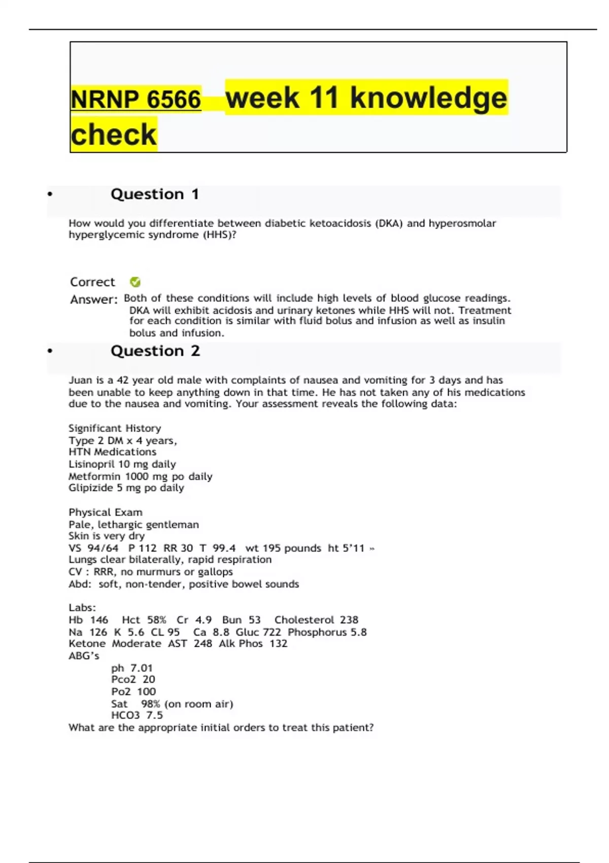 NRNP 6566 week 11 knowledge check How would you differentiate between diabetic ketoacidosis (DKA) and hyperosmolar hyperglycemic syndrome (HHS)? Correct Answer: Both of these conditions will include high levels of blood glucose readings. DKA will exhibit acidosis and urinary ketones while HHS will not. Treatment for each condition is similar with fluid bolus and infusion as well as insulin bolus and infusion. Juan is a 42 year old male with complaints of nausea and vomiting for 3 days and has been unable to keep anything down in that time. He has not taken any of his medications due to the nausea and vomiting. Your assessment reveals the following data: Significant History Type 2 DM x 4 years, HTN Medications Lisinopril 10 mg daily Metformin 1000 mg po daily Glipizide 5 mg po daily Physical Exam Pale, lethargic gentleman Skin is very dry VS 94/64 P 112 RR 30 T 99.4 wt 195 pounds ht 5’11 » Lungs clear bilaterally, rapid respiration CV : RRR, no murmurs or gallops Abd: soft, non-tender, positive bowel sounds Labs: Hb 146 Hct 58% Cr 4.9 Bun 53 Cholesterol 238 Na 126 K 5.6 CL 95 Ca 8.8 Gluc 722 Phosphorus 5.8 Ketone Moderate AST 248 Alk Phos 132 ABG’s ph 7.01 Pco2 20 Po2 100 Sat 98% (on room air) HCO3 7.5 What are the appropriate initial orders to treat this patient?
