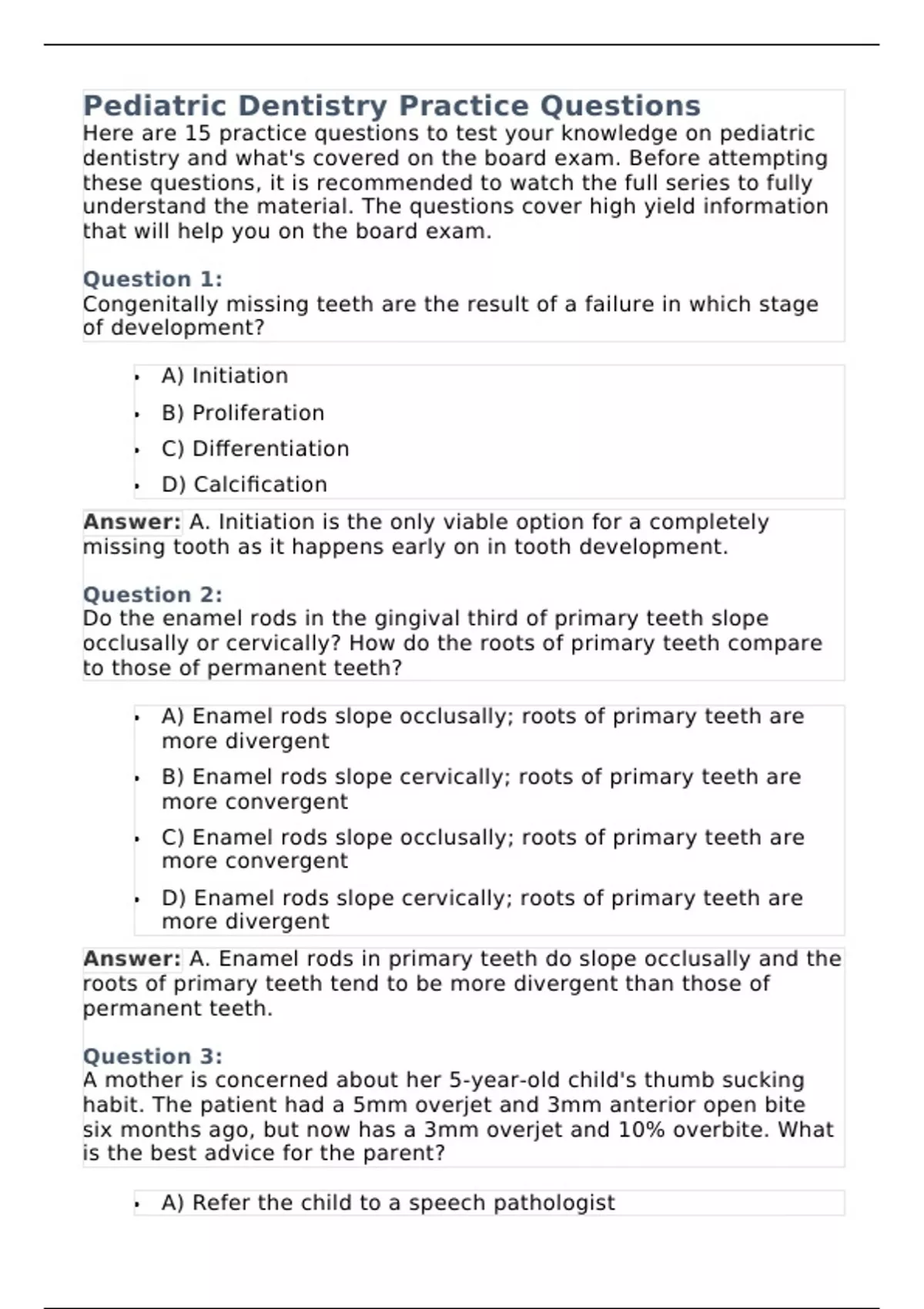 Here are 15 practice questions to test your knowledge on pediatric dentistry and what's covered on the board exam. Before attempting these questions, it is recommended to watch the full series to fully understand the material. The questions cover high yield information that will help you on the board exam.