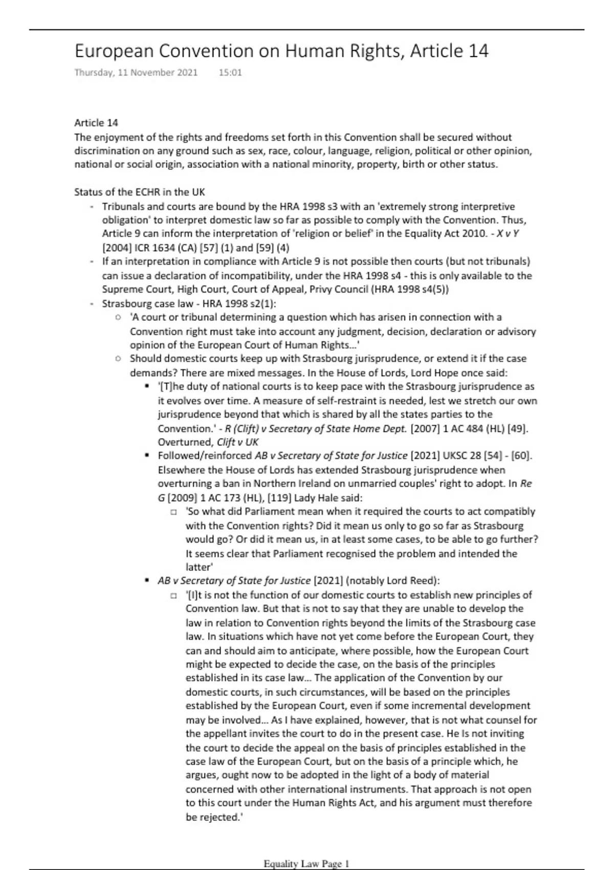 Article 9 can inform the interpretation of 'religion or belief' in the Equality Act 2010. - X v Y