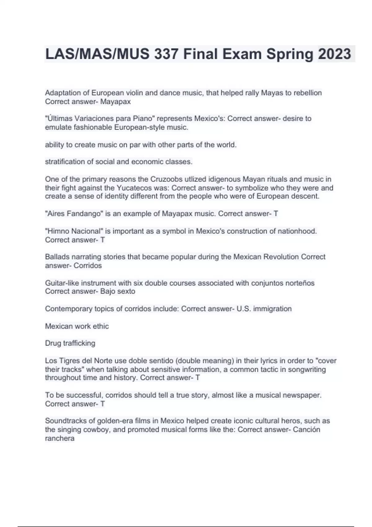 LAS/MAS/MUS 337 Final Exam Spring 2023. Adaptation of European violin and dance music, that helped rally Mayas to rebellion Correct answer- Mayapax "Últimas Variaciones para Piano" represents Mexico's: Correct answer- desire to emulate fashionable European-style music. ability to create music on par with other parts of the world. stratification of social and economic classes. One of the primary reasons the Cruzoobs utlized idigenous Mayan rituals and music in their fight against the Yucatecos was: Correct answer- to symbolize who they were and create a sense of identity different from the people who were of European descent. "Aires Fandango" is an example of Mayapax music. Correct answer- T "Himno Nacional" is important as a symbol in Mexico's construction of nationhood. Correct answer- T Ballads narrating stories that became popular during the Mexican Revolution Correct answer- Corridos Guitar-like instrument with six double courses associated with conjuntos norteños Correct answer- Bajo sexto Contemporary topics of corridos include: Correct answer- U.S. immigration Mexican work ethic Drug trafficking Los Tigres del Norte use doble sentido (double meaning) in their lyrics in order to "cover their tracks" when talking about sensitive information, a common tactic in songwriting throughout time and history. Correct answer- T To be successful, corridos should tell a true story, almost like a musical newspaper. Correct answer- T .