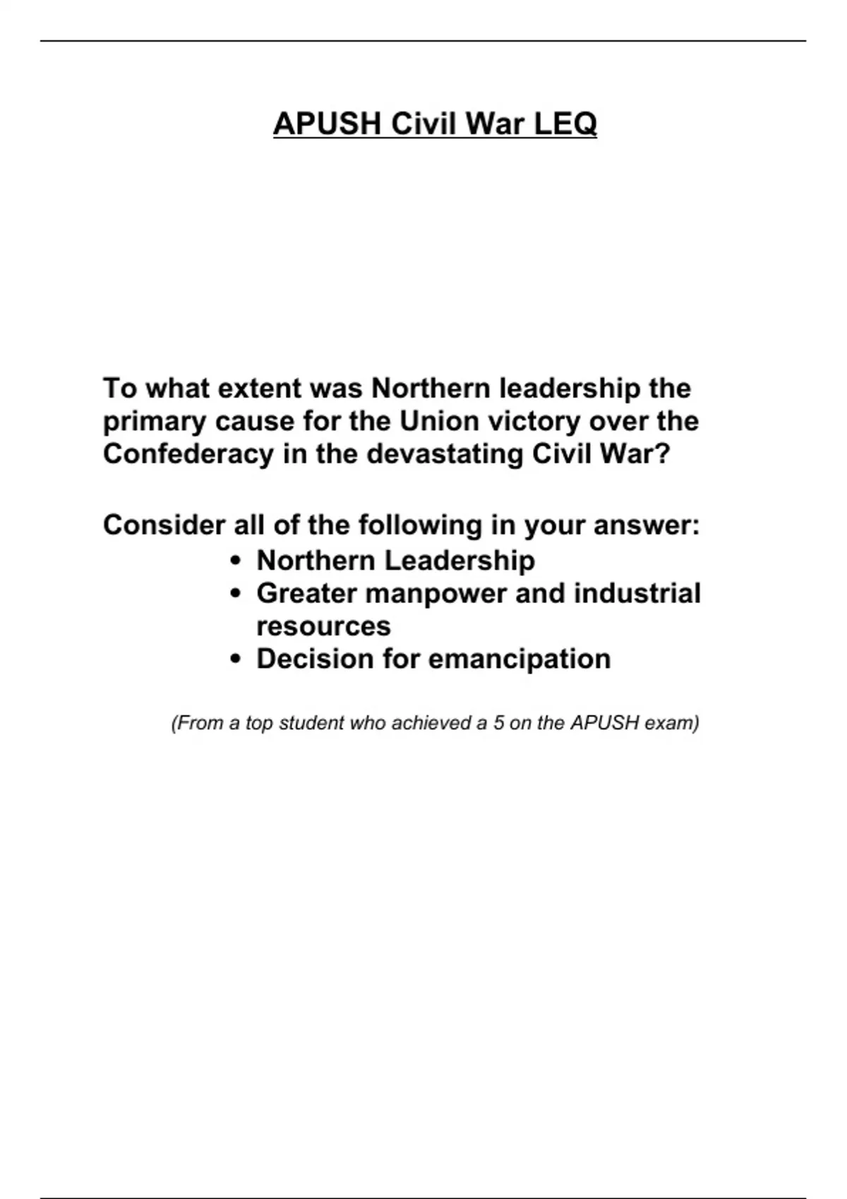 This essay answers the prompt: To what extent was Northern leadership the primary cause for the Union victory over the Confederacy in the devastating Civil War? Consider all of the following in your answer: Northern Leadership Greater manpower and industrial resources Decision for emancipation Answered with specific, detailed evidence. From a student who received a 5 on the APUSH essay.