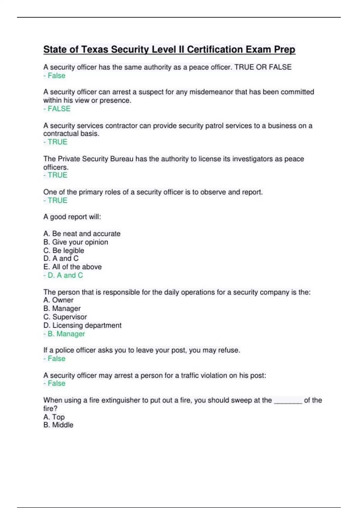 State of Texas Security Level II Certification Exam Prep A security officer has the same authority as a peace officer. TRUE OR FALSE A security officer can arrest a suspect for any misdemeanor that has been committed within his view or presence. A security services contractor can provide security patrol services to a business on a contractual basis. The Private Security Bureau has the authority to license its investigators as peace officers. One of the primary roles of a security officer is to observe and report. A good report will: A. Be neat and accurate B. Give your opinion C. Be legible D. A and C E. All of the above The person that is responsible for the daily operations for a security company is the: A. Owner B. Manager C. Supervisor D. Licensing department If a police officer asks you to leave your post, you may refuse. A security officer may arrest a person for a traffic violation on his post: When using a fire extinguisher to put out a fire, you should sweep at the _______ of the fire? A. Top B. Middle C. Base A security officer is required to make an arrest if he sees a crime committed on his post? What are the two basic types of arrests? A. Actual and Primary B. Primary and Constructive C. Actual and Constructive D. Primary and Secondary An officer is justified in using force in order to arrest a resisting suspect. A person breaks into a car shop after it is closed and steals a set of mufflers. The offense he committed is: A. Arson B. Burglary C. Theft D. Assault In order to legally arrest a suspect for a felony, the crime must be committed in the presence or view of the officer A security officer's responsibilities are to protect the specific people and property of his client. It is not necessary for a security officer to have his state issued card on his person while he is on duty. In order for an arrest to be legal, the intent of the security officer must be that the suspect be presented to a magistrate in order to answer for an alleged crime. In a security officer sees a crime committed on a property he is not assigned to, he should... A. Investigate the activity B. Confront the suspect C. Call the police A person is yelling obscene remarks to an employee at a retail store. The security officer asks him to leave and he refuses. The suspect can be arrested for... A. Arson B. Aggravated assault C. Theft D. Disturbing the peace and trespassing An employee forgot his company badge and is trying to get into his place of work. He has committed a... A. Felony B. Misdemeanor C. Breach of company policy There are two types of crimes, felonies and misdemeanors. A misdemeanor is the crime that carries the most punishment. The two basic types of written reports. A. Narrative and Coded B. Coded and Constructive C. Pre-printed and Constructive D. Narrative and Pre-Printed Handwritten field notes can be demanded as evidence in a court case. Which type of fire extinguisher should be used to put out an electrical fire? A. A B. B C. C D. D If you receive a bomb threat on the phone, you should immediately evacuate the building for the safety of the employees. Any vehicle that transports hazardous material should have a _____ shaped sign showing what type of hazardous material is on board? A. Square B. Circle C. Diamond D. Rectangle A security officer's uniform may have the state flag on the sleeve since the licensing is done through the state. The commission has the power to subpoena a security officer to appear at a hearing at any time. The government agency that regulates radio transmission is... A. FAA B. FCC C. TSA D. None of the above The lowest level of force in the Use of Force Continuum is: A. Verbal command B. Soft empty hand C. Officer presence D. Uniform presence If a security officer sees an object on his round that he thinks could be a bomb, he should immediately radio his supervisor. The object of conflict resolution is to gain voluntary compliance. What dictates the reason a security officer can escalate the use of force? A. Justifiable homicide B. Totality of circumstance C. Subpoena duces A person that operates a security company without a license has committed a: A. Class B misdemeanor B. Felony C. Class A misdemeanor A security officer is justified to use force in response to verbal provocation alone. Medical treatment should not be given by a security officer unless he has been certified. Deadly force may be used by a security officer on duty in which of the following situations: A. Self defense B. Defense of a third party C. To stop a suicide attempt D. A and B E. None of the above F. All of the above Verbal command is the second level of the Use of Force Continuum. It is used to: A. Direct the suspect B. Appear tough to gain respect C. Let witnesses know you are trying to gain compliance D. A and C E. All of the above An example of good command presence would be to stand with your hand on your gun. Communication is accomplished primarily by: A. The words of the message B. Non-verbal communication C. Your appearance A security officer's job does not include reporting safety hazards. A written report can be used as evidence in a court case one year after the incident. You are a non-commissioned officer and while walking your rounds you see two armed men breaking into your building. You should: A. Confront the men B. Call the police C. Observe and report D. B and C E. All of the above In writing a report you must include: A. Who, what, when, why, where and how B. Your opinion C. What you were doing the night before A security officer should always speak to all different types of people with different backgrounds using the same words, tone of voice and demeanor in order to communicate the message. A security officer should check their radio for proper function: A. When they start their shift on the site B. Within one hour after their shift starts C. Before their shift starts The pocket card given to the security officer is the property of the: A. Officer B. The licensed com