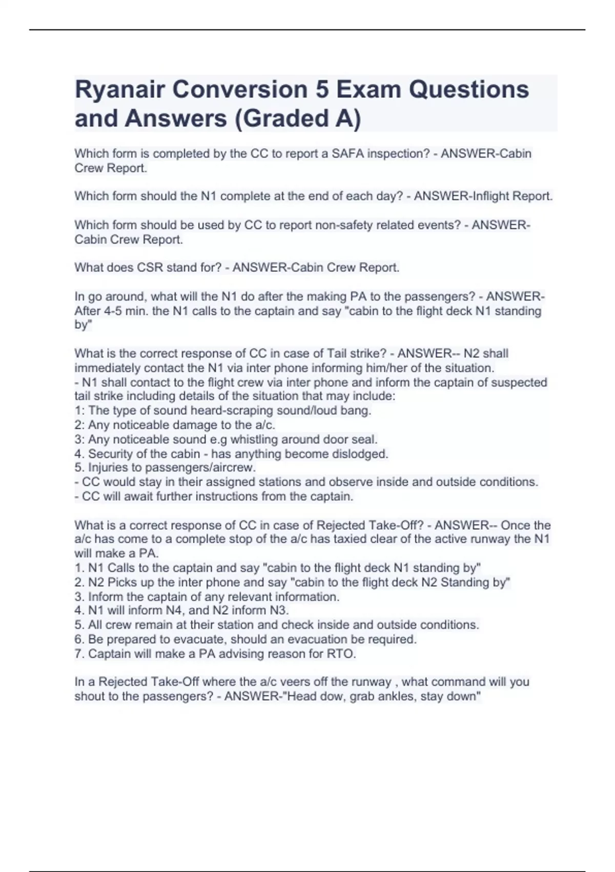 Ryanair Conversion 5 Exam Questions and Answers (Graded A)Ryanair Conversion 5 Exam Questions and Answers (Graded A)Ryanair Conversion 5 Exam Questions and Answers (Graded A) Which form is completed by the CC to report a SAFA inspection? - ANSWER-Cabin Crew Report. Which form should the N1 complete at the end of each day? - ANSWER-Inflight Report. Which form should be used by CC to report non-safety related events? - ANSWER-Cabin Crew Report. What does CSR stand for? - ANSWER-Cabin Crew Report. In go around, what will the N1 do after the making PA to the passengers? - ANSWER-After 4-5 min. the N1 calls to the captain and say "cabin to the flight deck N1 standing by" What is the correct response of CC in case of Tail strike? - ANSWER-- N2 shall immediately contact the N1 via inter phone informing him/her of the situation. - N1 shall contact to the flight crew via inter phone and inform the captain of suspected tail strike including details of the situation that may include: 1: The type of sound heard-