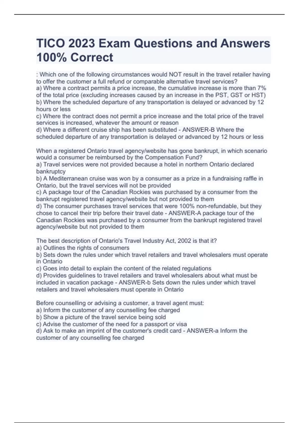 TICO 2023 Exam Questions and Answers 100% Correct TICO 2023 Exam Questions and Answers 100% Correct TICO 2023 Exam Questions and Answers 100% Correct : Which one of the following circumstances would NOT result in the travel retailer having to offer the customer a full refund or comparable alternative travel services? a) Where a contract permits a price increase, the cumulative increase is more than 7% of the total price (excluding increases caused by an increase in the PST, GST or HST) b) Where the scheduled departure of any transportation is delayed or advanced by 12 hours or less c) Where the contract does not permit a price increase and the total price of the travel services is increased, whatever the amount or reason d) Where a different cruise ship has been substituted - ANSWER-B Where the scheduled departure of any transportation is delayed or advanced by 12 hours or less When a registered Ontario travel agency/website has gone bankrupt, in which scenario would a consumer be reimbursed by the Compensation Fund? a) Travel services were not provided because a hotel in northern Ontario declared bankruptcy b) A Mediterranean cruise was won by a consumer as a prize in a fundraising raffle in Ontario, but the travel services will not be provided c) A package tour of the Canadian Rockies was purchased by a consumer from the bankrupt registered travel agency/website but not provided to them d) The consumer purchases travel services that were 100% non-refundable, but they chose to cancel their trip before their travel date - ANSWER-A package tour of the Canadian Rockies was purchased by a consumer from the bankrupt registered travel agency/website but not provided to them The best description of Ontario's Travel Industry Act, 2002 is that it? a) Outlines the rights of consumers b) Sets down the rules under which travel retailers and travel wholesalers must operate in Ontario c) Goes into detail to explain the content of the related regulations d) Provides guidelines to travel retailers and travel wholesalers about what must be included in vacation package - ANSWER-b Sets down the rules under which travel retailers and travel wholesalers must operate in Ontario Before counselling or advising a customer, a travel agent must: a) Inform the customer of any counselling fee charged b) Show a picture of the travel service being sold c) Advise the customer of the need for a passport or visa d) Ask to make an imprint of the customer's credit card - ANSWER-a Inform the customer of any counselling fee charged