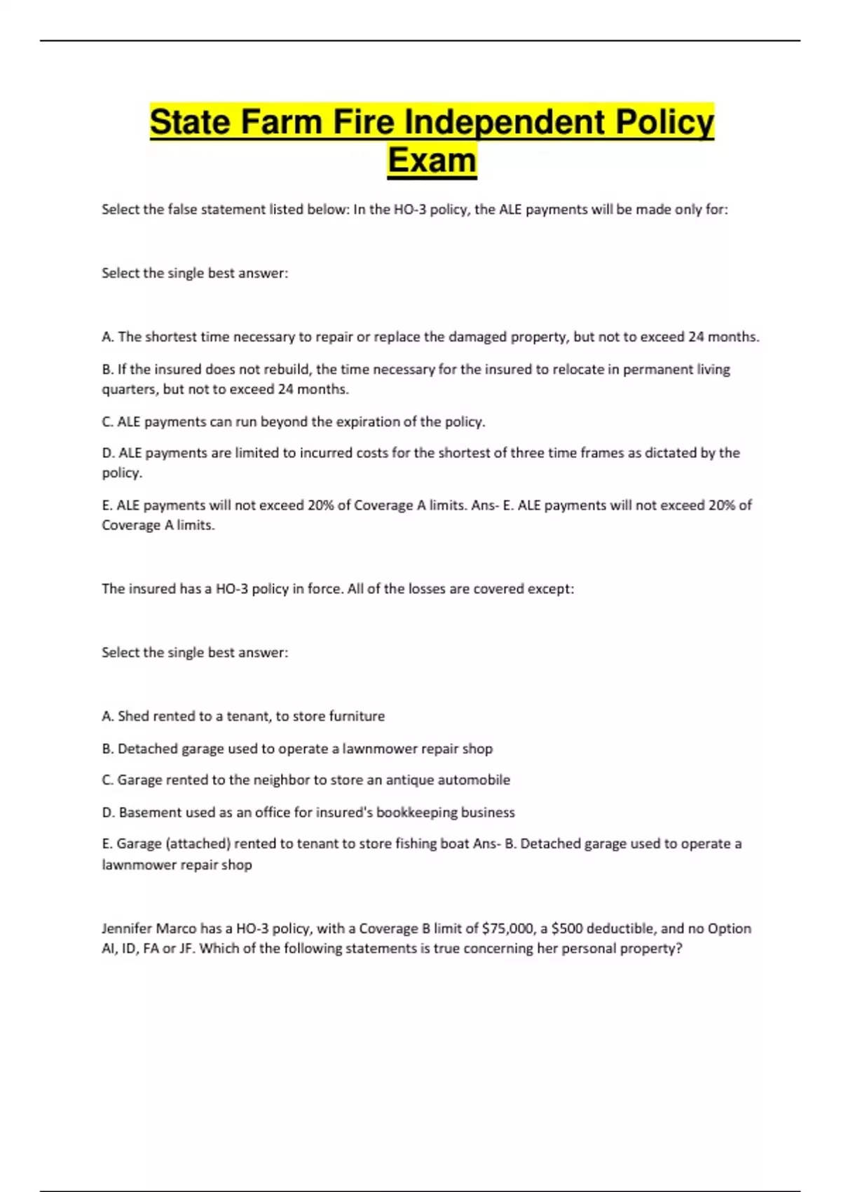 State Farm Fire Independent Policy Exam Select the false statement listed below: In the HO-3 policy, the ALE payments will be made only for: Select the single best answer: A. The shortest time necessary to repair or replace the damaged property, but not to exceed 24 months. B. If the insured does not rebuild, the time necessary for the insured to relocate in permanent living quarters, but not to exceed 24 months. C. ALE payments can run beyond the expiration of the policy. D. ALE payments are limited to incurred costs for the shortest of three time frames as dictated by the policy. E. ALE payments will not exceed 20% of Coverage A limits. Ans- E. ALE payments will not exceed 20% of Coverage A limits. The insured has a HO-3 policy in force. All of the losses are covered except: Select the single best answer: A. Shed rented to a tenant, to store furniture B. Detached garage used to operate a lawnmower repair shop C. Garage rented to the neighbor to store an antique automobile D. Basement used as an office for insured's bookkeeping business E. Garage (attached) rented to tenant to store fishing boat Ans- B. Detached garage used to operate a lawnmower repair shop Jennifer Marco has a HO-3 policy, with a Coverage B limit of $75,000, a $500 deductible, and no Option AI, ID, FA or JF. Which of the following statements is true concerning her personal property? Select the single best answer: A. Coverage for personal property applies for perils listed under Section I - Losses Insured, Coverage B - Personal Property and Section I - Additional Coverages. B. Coverage B applies only for items Jennifer owns, while anywhere in the world. C. The limit of liability for theft loss to jewelry and furs is $1000 or 10% of the Coverage B limit, whichever is greater. D. The limit of liability for tornado losses to firearms is $2,500. Ans- A. Coverage for personal property applies for perils listed under Section I - Losses Insured, Coverage B - Personal Property and Section I - Additional Coverages. Under an HO-3 policy, deductibles apply to which of the following type(s) of losses. Select the single best answer: A. Credit Card, Bank Fund Transfer Card, Forgery and Counterfeit Money B. Fire Department Service Charges C. Rekey locks after keys are stolen D. Debris Removal Charges Ans- B. Fire Department Service Charges In the HO-3 policy, Coverage C consists of three coverages: Additional Living Expense Fair Rental Value Property Removed True or False Ans- False its Additional Living expense, Fair rental value and prohibited use The steps in applying the deductible on a HO-3 homeowners policy are: 1.)The deductible is first applied to the covered loss. 2.)Any coverage or special limits are then applied to the covered loss. 3.)The amount payable to the insured will be the greater of the amounts arrived at in steps 1 and 2. True or False Ans- True The definition of an insured includes all of the following except: Select the single best answer: A. Person(s) listed on the Declaration Page B. Spouse, if a resident of the household C. Relatives, if residents of the household D. Any person under the age of 21 in the care of the named insured, resident spouse, or a resident relative E. Spouse Ans- Spouse Joe Smith has a HO-3 policy. He is a carpenter and has collected 100 2"X4" studs and 30 2"X6" rafters from various job sites. Joe has no specific plans to use the lumber. The lumber is covered under Coverage A. True or False Ans- False Under an HO-3 policy, which of the following would be a Coverage B item? Select the single best answer: A. Satellite dish bolted to the eave of the house B. Free standing gas range C. Built-in microwave oven D. Automatic garage door opener E. Water softener system Ans- Free Standing gas range Under an HO-3 policy, which of the following would not be a Coverage A item? Select the single best answer: A. Automatic lawn sprinkler system B. Wall to wall carpet attached to the dwelling C. A new (in the box), built-in microwave oven the insured intends to install in his fishing cabin. D. A shed, on a foundation, rented to a neighbor to store the neighbor's boat E. Materials and supplies to build bookshelves in the basement of the residence premises and stored in the garage Ans- E. Materials and supplies to build bookshelves in the basement of the residence premises and stored in the garage An HO-3 homeowners policy with a $250 deductible is in force and the policy limits (Coverage A and Coverage B) are adequate to cover this damage. During a severe windstorm, rain blows through open windows and causes the following damage: Hardwood floor in the dining room $1,700 Water stains on the drywall $ 220 Water stains on the area rug $125 Antique vase (broken by force of wind) $375 How much should you pay on this loss? All repairs have been made. Select the single best answer: A. $ 0 B. $1,920 C. $2,420 D. $2,170 E. $2,045 Ans- 2170 If a picture falls from a wall and damages an expensive statue, under the HO-3 coverage for the statue would: Select the single best answer: A. Apply under the falling object peril B. Not apply, not an insured peril C. Apply under the collapse peril D. Not apply since it should have been insured under a personal articles policy E. None of the above Ans- not apply, not an insured peril Bill Smith constructed an awning beside his detached garage, under which he stores his small fishing boat. He screwed the framing of the awning to the fascia of the garage and supported the other side with posts set in concrete. Since the awning has no foundation, it is not considered a Coverage A item. True or False Ans- False Mike and Jennifer Reed have an HO -3 policy in force with $250 deductible. Lightning struck the insured's house, damaging the house and the contents. Mike is a policeman and operates a engine repair shop in a shed on the insured premises. Jennifer is a sales representative and often has samples and merchandise at the house. The following items where listed on the personal 