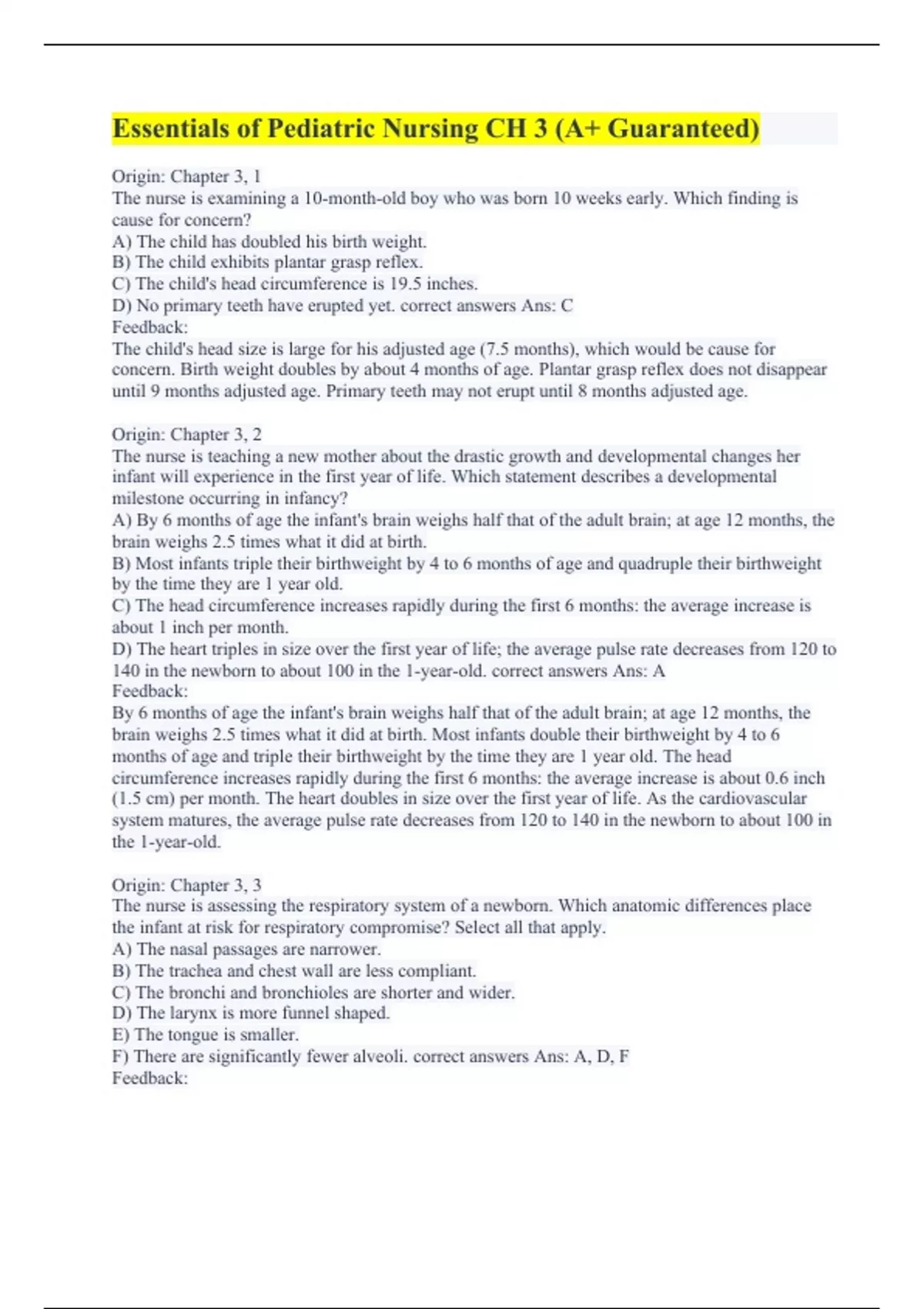 Origin: Chapter 3, 1 The nurse is examining a 10-month-old boy who was born 10 weeks early. Which finding is cause for concern? A) The child has doubled his birth weight. B) The child exhibits plantar grasp reflex. C) The child's head circumference is 19.5 inches. D) No primary teeth have erupted yet. correct answers Ans: C Feedback: The child's head size is large for his adjusted age (7.5 months), which would be cause for concern. Birth weight doubles by about 4 months of age. Plantar grasp reflex does not disappear until 9 months adjusted age. Primary teeth may not erupt until 8 months adjusted age. Origin: Chapter 3, 2 The nurse is teaching a new mother about the drastic growth and developmental changes her infant will experience in the first year of life. Which statement describes a developmental milestone occurring in infancy? A) By 6 months of age the infant's brain weighs half that of the adult brain; at age 12 months, the brain weighs 2.5 times what it did at birth. B) Most infants triple their birthweight by 4 to 6 months of age and quadruple their birthweight by the time they are 1 year old. C) The head circumference increases rapidly during the first 6 months: the average increase is about 1 inch per month. D) The heart triples in size over the first year of life; the average pulse rate decreases from 120 to 140 in the newborn to about 100 in the 1-year-old. correct answers Ans: A Feedback: By 6 months of age the infant's brain weighs half that of the adult brain; at age 12 months, the brain weighs 2.5 times what it did at birth. Most infants double their birthweight by 4 to 6 months of age and triple their birthweight by the time they are 1 year old. The head circumference increases rapidly during the first 6 months: the average increase is about 0.6 inch (1.5 cm) per month. The heart doubles in size over the first year of life. As the cardiovascular system matures, the average pulse rate decreases from 120 to 140 in the newborn to about 100 in the 1-year-old. Origin: Chapter 3, 3 The nurse is assessing the respiratory system of a newborn. Which anatomic differences place the infant at risk for respiratory compromise? Select all that apply. A) The nasal passages are narrower. B) The trachea and chest wall are less compliant. C) The bronchi and bronchioles are shorter and wider. D) The larynx is more funnel shaped. E) The tongue is smaller. F) There are significantly fewer alveoli. correct answers Ans: A, D, F Feedback: