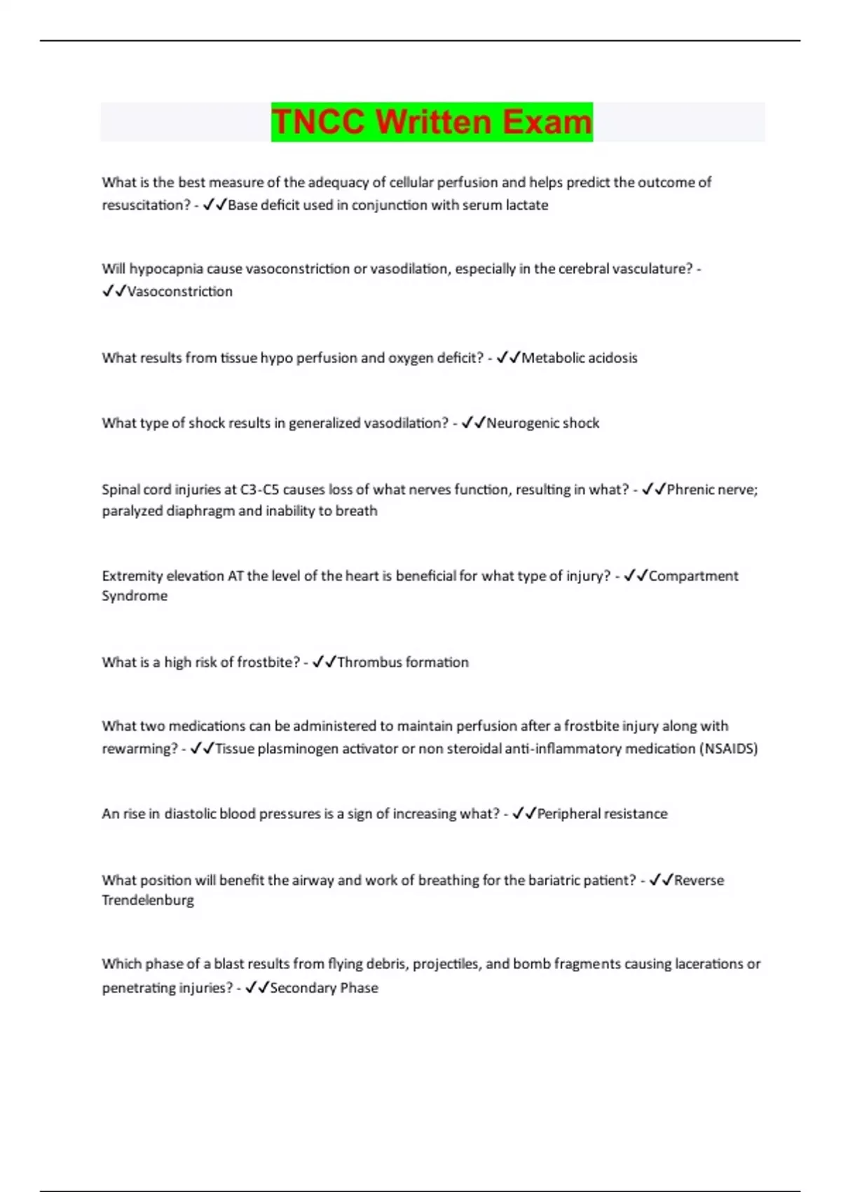 TNCC Written Exam | 92 Questions with 100% Correct Answers | Latest Update | Verified