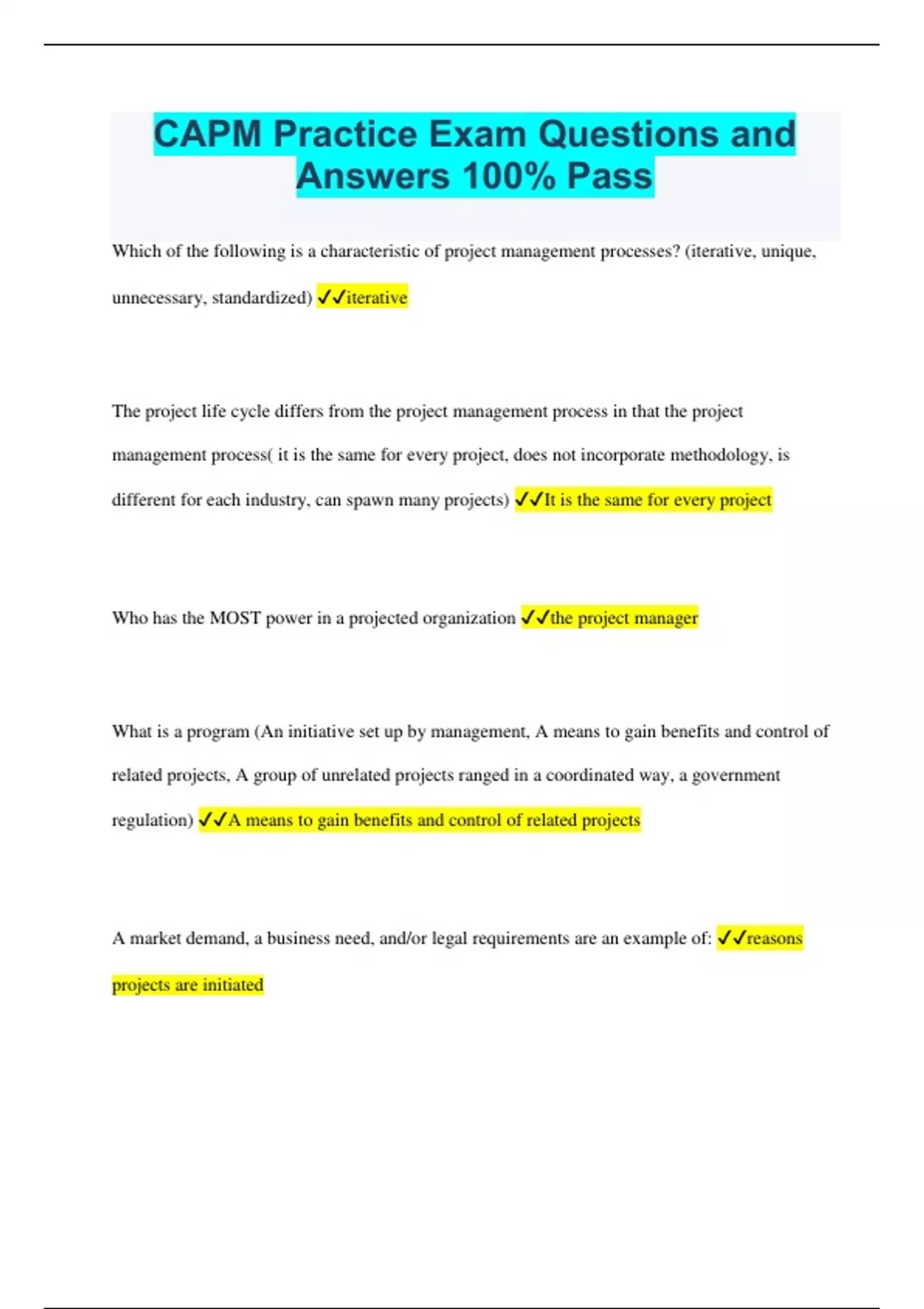 CAPM Practice Exam Questions and Answers 100% Pass Which of the following is a characteristic of project management processes? (iterative, unique, unnecessary, standardized) iterative The project life cycle differs from the project management process in that the project management process( it is the same for every project, does not incorporate methodology, is different for each industry, can spawn many projects) It is the same for every project Who has the MOST power in a projected organization the project manager What is a program (An initiative set up by management, A means to gain benefits and control of related projects, A group of unrelated projects ranged in a coordinated way, a government regulation) A means to gain benefits and control of related projects A market demand, a business need, and/or legal requirements are an example of: reasons projects are initiated Operation work is different from project work in that operation work is (unique, temporary , ongoing and repetitive , A part of every project activity) ongoing and repetitive In a projected organization, the project team: (reports to many bosses, has no loyalty to the project, reports to the functioning manager, will not always have a home) will not always have a home What rule is being ignored when a project that was originally scheduled for completion in six moths has been ongoing for two years projects are temporary How would you describe the main difference between a matrix organization and a functional organization in relation to the boss dynamic The project team members usually report to two bosses in a matrix organization- the functional manager and the project manager A group of programs to achieve a specific strategic business goal is called a portfolio A project manager is trying to complete a software development project but cannot get enough attention for the project. Resources are focused on completing process-related work, and the project manager has little authority to properly assign resources. What form of organization must the project manager be working in? Functional A project team member is talking to another team member and complains that many people are asking him to do things. if he works in a functional organization, who has the power to give him direction? the functional manager Which of the following is NOT a project constraint (scope, cost, time, appearance) appearance A frequent complaint about matrix organization is that communication are (hard to automate, closed and inaccurate, complex, misleading) Complex