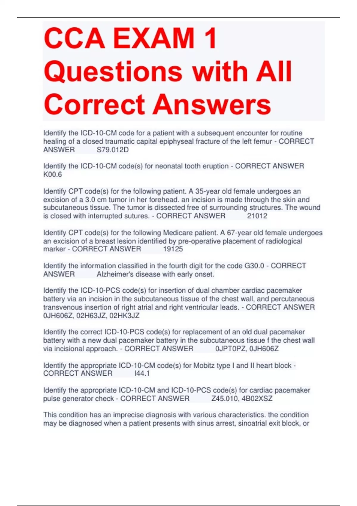 CCA EXAM 1 Questions with All Correct Answers Identify the ICD-10-CM code for a patient with a subsequent encounter for routine healing of a closed traumatic capital epiphyseal fracture of the left femur - CORRECT ANSWER S79.012D Identify the ICD-10-CM code(s) for neonatal tooth eruption - CORRECT ANSWER K00.6 Identify CPT code(s) for the following patient. A 35-year old female undergoes an excision of a 3.0 cm tumor in her forehead. an incision is made through the skin and subcutaneous tissue. The tumor is dissected free of surrounding structures. The wound is closed with interrupted sutures. - CORRECT ANSWER 21012 Identify CPT code(s) for the following Medicare patient. A 67-year old female undergoes an excision of a breast lesion identified by pre-operative placement of radiological marker - CORRECT ANSWER 19125 Identify the information classified in the fourth digit for the code G30.0 - CORRECT ANSWER Alzheimer's disease with early onset. Identify the ICD-10-PCS code(s) for insertion of dual chamber cardiac pacemaker battery via an incision in the subcutaneous tissue of the chest wall, and percutaneous transvenous insertion of right atrial and right ventricular leads. - CORRECT ANSWER 0JH606Z, 02H63JZ, 02HK3JZ Identify the correct ICD-10-PCS code(s) for replacement of an old dual pacemaker battery with a new dual pacemaker battery in the subcutaneous tissue f the chest wall via incisional approach. - CORRECT ANSWER 0JPT0PZ, 0JH606Z Identify the appropriate ICD-10-CM code(s) for Mobitz type I and II heart block - CORRECT ANSWER I44.1 Identify the appropriate ICD-10-CM and ICD-10-PCS code(s) for cardiac pacemaker pulse generator check - CORRECT ANSWER Z45.010, 4B02XSZ This condition has an imprecise diagnosis with various characteristics. the condition may be diagnosed when a patient presents with sinus arrest, sinoatrial exit block, or persistent sinus bradycardia. It is often the result of drug therapy, such as digitalis, calcium channel blockers, beta-blockers, sympatholytic agents, or antiarrhythmics. Another presentation includes recurrent supraventricular tachycardias associated with Brady arrhythmias . Prolonged ambulatory monitoring may be indicated to establish a diagnosis of this condition. Treatment includes insertion of a permanent cardiac pacemaker - CORRECT ANSWER Sick sinus syndrome (SSS) (I49.5) Identify the appropriate ICD-10-PCS code(s) for a coronary artery bypass of two sites, one using the left internal mammary artery to the left proximal anterior descending artery, and one using the right internal mammary artery to the distal left anterior descending artery, both done via thoracotomy. - CORRECT ANSWER 02100Z8, 02100Z9 Coronary arteriography serves as a diagnostic tool in detecting obstruction within the coronary arteries. Identify the technique using two catheters inserted percutaneously through the femoral artery - CORRECT ANSWER Judkins