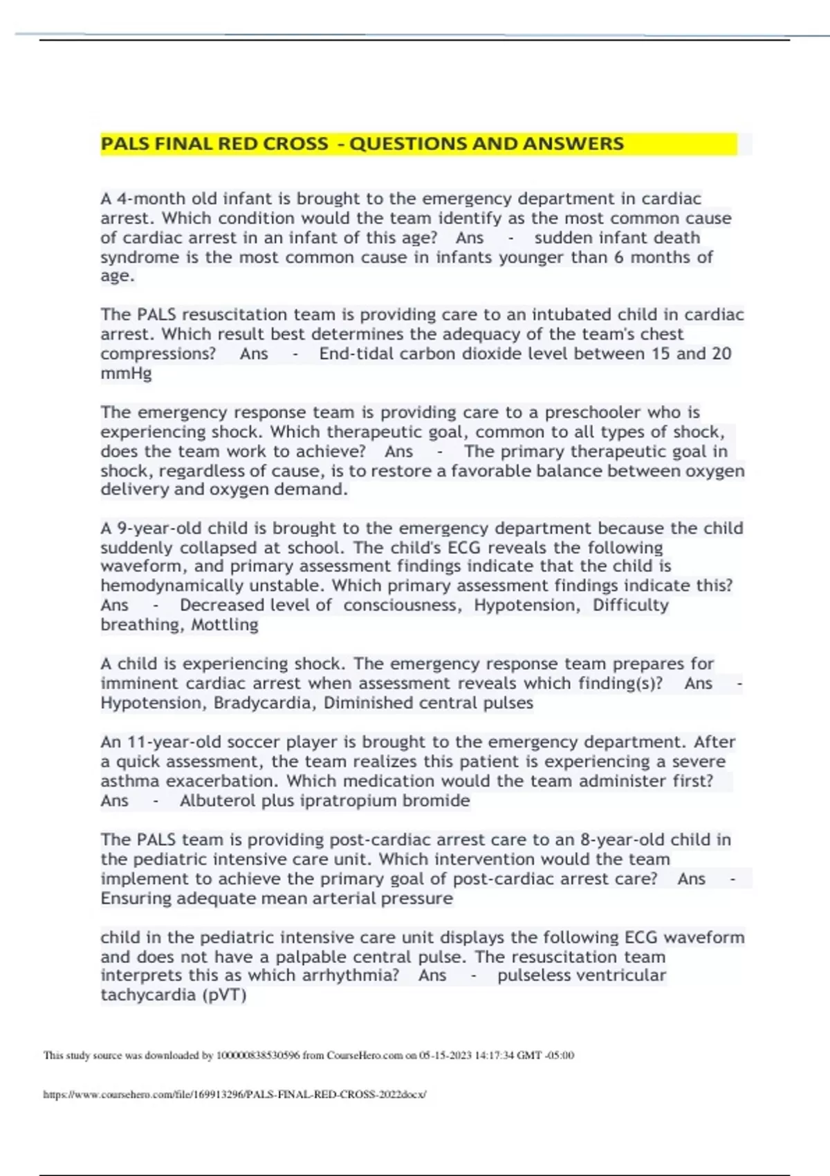 PALS FINAL RED CROSS - QUESTIONS AND ANSWERS GRADED A+