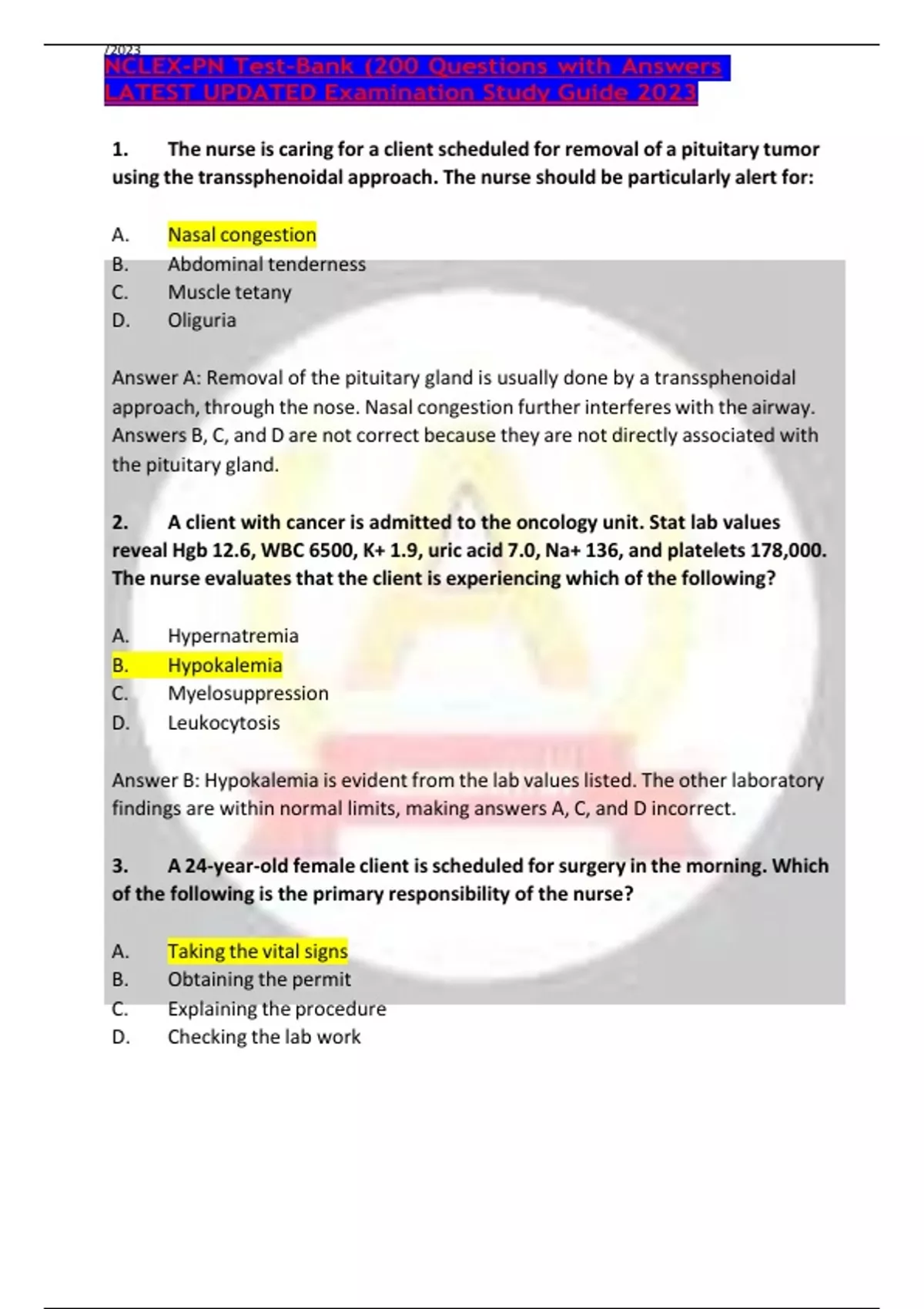 NCLEX-PN Test-Bank (200 Questions with Answers LATEST UPDATED Examination Study Guide 2023 1. The nurse is caring for a client scheduled for removal of a pituitary tumor using the transsphenoidal approach. The nurse should be particularly alert for: A. Nasal congestion B. Abdominal tenderness C. Muscle tetany D. Oliguria Answer A: Removal of the pituitary gland is usually done by a transsphenoidal approach, through the nose. Nasal congestion further interferes with the airway. Answers B, C, and D are not correct because they are not directly associated with the pituitary gland. 2. A client with cancer is admitted to the oncology unit. Stat lab values reveal Hgb 12.6, WBC 6500, K+ 1.9, uric acid 7.0, Na+ 136, and platelets 178,000. The nurse evaluates that the client is experiencing which of the following? A. Hypernatremia B. Hypokalemia C. Myelosuppression D. Leukocytosis Answer B: Hypokalemia is evident from the lab values listed. The other laboratory findings are within normal limits, making answers A, C, and D incorrect. 3. A 24-year-old female client is scheduled for surgery in the morning. Which of the following is the primary responsibility of the nurse? A. Taking the vital signs B. Obtaining the permit C. Explaining the procedure D. Checking the lab work Answer A: The primary responsibility of the nurse is to take the vital signs before any surgery. The actions in answers B, C, and D are the responsibility of the doctor and, therefore, are incorrect for this question. 4. The nurse is working in the emergency room when a client arrives with severe burns of the left arm, hands, face, and neck. Which action should receive priority? A. Starting an IV B. Applying oxygen C. Obtaining blood gases D. Medicating the client for pain Answer B: The client with burns to the neck needs airway assessment and supplemental oxygen, so applying oxygen is the priority. The next action should be to start an IV and medicate for pain, making answers A and C incorrect. Answer D, obtaining blood gases, is ordered by the doctor. 5. The nurse is visiting a home health client with osteoporosis. The client has a new prescription for alendronate (Fosamax). Which instruction should be given to the client? A. Rest in bed after taking the medication for at least 30 minutes B. Avoid rapid movements after taking the medication C. Take the medication with water only D. Allow at least 1 hour between taking the medicine and taking other medications Answer B: The client with burns to the neck needs airway assessment and supplemental oxygen, so applying oxygen is the priority. The next action should be to start an IV and medicate for pain, making answers A and C incorrect. Answer D, obtaining blood gases, is ordered by the doctor. 6. The nurse is making initial rounds on a client with a C5 fracture and crutchfield tongs. Which equipment should be kept at the bedside? A. A pair of forceps B. A torque wrench C. A pair of wire cutters D. A screwdriver Answer B: A torque wrench is kept at the bedside to tighten and loosen the screws of crutchfield tongs. This wrench controls the amount of pressure that is placed on the screws. A pair of forceps, wire cutters, and a screwdriver, in answers A, C, and D, would not be used and, thus, are incorrect. 7. An infant weighs 7 pounds at birth. The expected weight by 1 year should be: A. 10 pounds B. 12 pounds C. 18 pounds D. 21 pounds Answer D: A birth weight of 7 pounds would indicate 21 pounds in 1 year, or triple his birth weight. Answers A, B, and C therefore are incorrect. 8. A client is admitted with a Ewing’s sarcoma. Which symptoms would be expected due to this tumor’s location? A. Hemiplegia B. Aphasia C. Nausea D. Bone pain Answer D: Sarcoma is a type of bone cancer; therefore, bone pain would be expected. Answers A, B, and C are not specific to this type of cancer and are incorrect. 9. The nurse is caring for a client with epilepsy who is being treated with carbamazepine (Tegretol). Which laboratory value might indicate a serious side effect of this drug? A. Uric acid of 5mg/dL B. Hematocrit of 33% C. WBC 2,000 per cubic millimeter D. Platelets 150,000 per cubic millimeter Answer C: Tegretol can suppress the bone marrow and decrease the white blood cell count; thus, a lab value of WBC 2,000 per cubic millimeter indicates side effects of the drug. Answers A and D are within normal limits, and answer B is a lower limit of normal; therefore, answers A, B, and D are incorrect. 10. A 6-month-old client is admitted with possible intussuception. Which question during the nursing history is least helpful in obtaining information regarding this diagnosis? A. “Tell me about his pain.” B. “What does his vomit look like?” C. “Describe his usual diet.” D. “Have you noticed changes in his abdominal size?” Answer C: The least-helpful questions are those describing his usual diet. A, B, and D are useful in determining the extent of disease process and, thus, are incorrect. 11. The nurse is assisting a client with diverticulosis to select appropriate foods. Which food should be avoided? A. Bran B. Fresh peaches C. Cucumber salad D. Yeast rolls Answer C: The client with diverticulitis should avoid foods with seeds. The foods in answers A, B, and D are allowed; in fact, bran cereal and fruit will help prevent constipation. 12. A client has rectal cancer and is scheduled for an abdominal perineal resection. What should be the priority nursing care during the post-op period? A. Teaching how to irrigate the illeostomy B. Stopping electrolyte loss in the incisional area C. Encouraging a high-fiber diet D. Facilitating perineal wound drainage Answer D: The client with a perineal resection will have a perineal incision. Drains will be used to facilitate wound drainage. This will help prevent infection of the surgical site. The client will not have an illeostomy, as in answer A; he will have some electrolyte loss, but treatment is not focused on preventing the loss, so answer B i