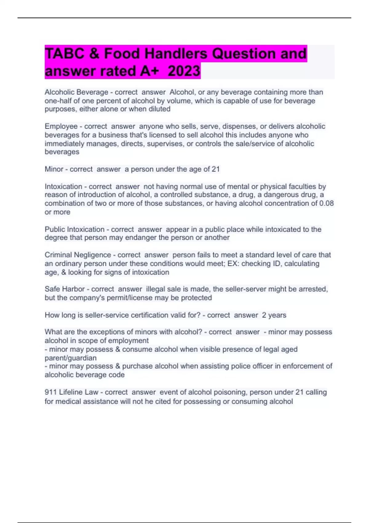 TABC & Food Handlers Question and answer rated A+ 2023Alcoholic Beverage Alcohol, or any beverage containing more than one-half of one percent of alcohol by volume, which is capable of use for beverage purposes, either alone or when diluted Employee anyone who sells, serve, dispenses, or delivers alcoholic beverages for a business that's licensed to sell alcohol this includes anyone who immediately manages, directs, supervises, or controls the sale/service of alcoholic beverages Minor a person under the age of 21 Intoxication not having normal use of mental or physical faculties by reason of introduction of alcohol, a controlled substance, a drug, a dangerous drug, a combination of two or more of those substances, or having alcohol concentration of 0.08 or more Public Intoxication appear in a public place while intoxicated to the degree that person may endanger the person or another Criminal Negligence person fails to meet a standard level of care that an ordinary person under these conditions would meet; EX: checking ID, calculating age, & looking for signs of intoxication