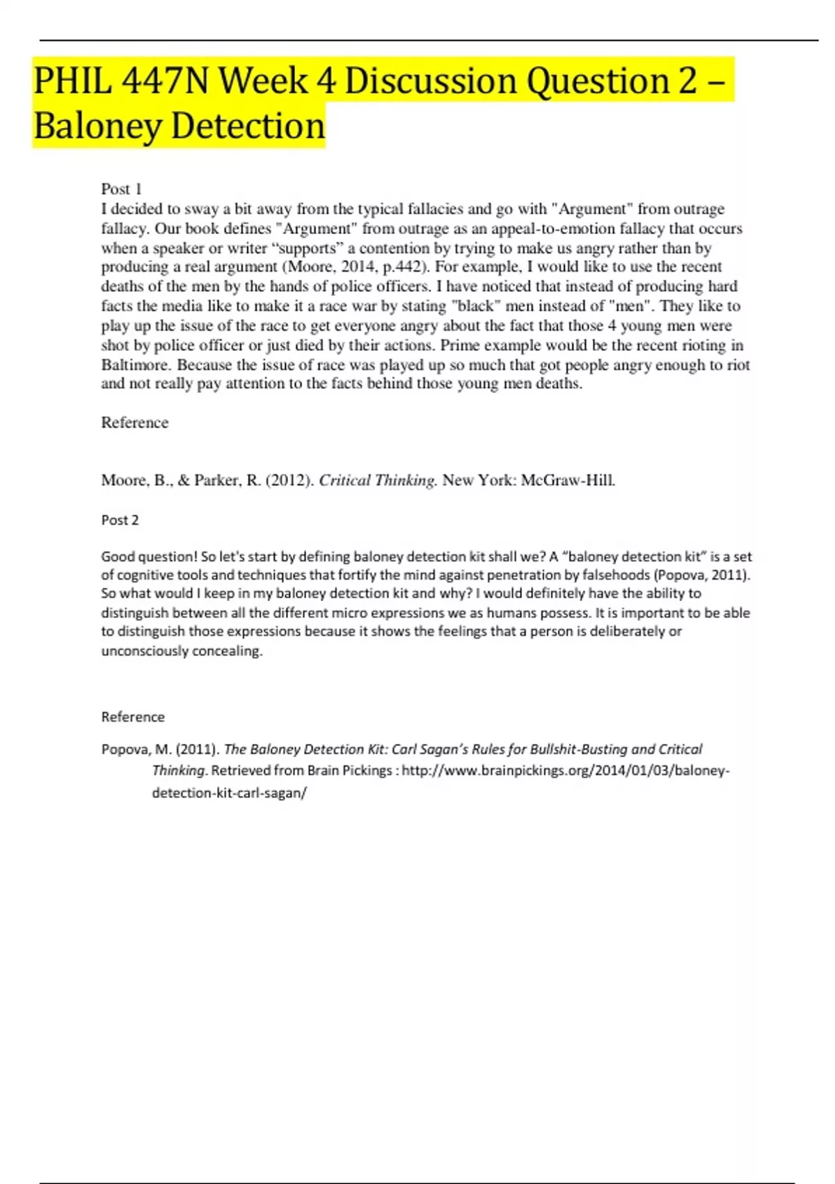 PHIL 447N Week 4 Discussion Question 2 – Baloney Detection - Discussion Graded An A
