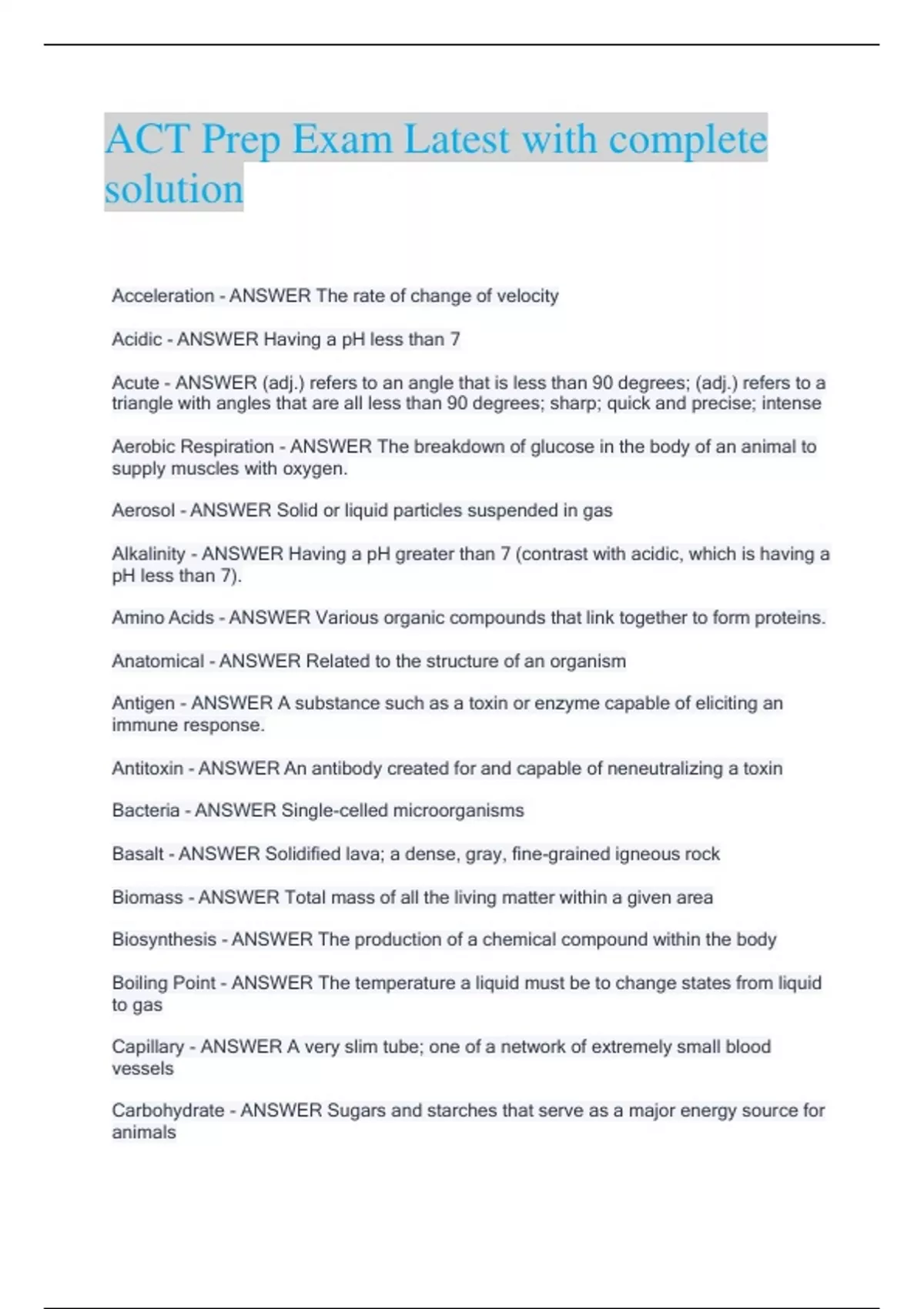 ACT Prep Exam Latest with complete solution Acceleration - ANSWER The rate of change of velocity Acidic - ANSWER Having a pH less than 7 Acute - ANSWER (adj.) refers to an angle that is less than 90 degrees; (adj.) refers to a triangle with angles that are all less than 90 degrees; sharp; quick and precise; intense Aerobic Respiration - ANSWER The breakdown of glucose in the body of an animal to supply muscles with oxygen. Aerosol - ANSWER Solid or liquid particles suspended in gas Alkalinity - ANSWER Having a pH greater than 7 (contrast with acidic, which is having a pH less than 7). Amino Acids - ANSWER Various organic compounds that link together to form proteins. Anatomical - ANSWER Related to the structure of an organism Antigen - ANSWER A substance such as a toxin or enzyme capable of eliciting an immune response. Antitoxin - ANSWER An antibody created for and capable of neneutralizing a toxin Bacteria - ANSWER Single-celled microorganisms Basalt - ANSWER Solidified lava; a dense, gray, fine-grained igneous rock Biomass - ANSWER Total mass of all the living matter within a given area Biosynthesis - ANSWER The production of a chemical compound within the body Boiling Point - ANSWER The temperature a liquid must be to change states from liquid to gas Capillary - ANSWER A very slim tube; one of a network of extremely small blood vessels Carbohydrate - ANSWER Sugars and starches that serve as a major energy source for animals Catalyst - ANSWER An agent that causes or speeds up a chemical reaction Celsius - ANSWER A temperature scale in which the freezing point of water is 0 degrees and the boiling point is 100 degrees under normal atmospheric conditions Cerebral Edema - ANSWER Brain swelling Chlorophyll - ANSWER A green pigment produced in response to sunlight during photosynthesis. Cholesterol - ANSWER A soft, waxy compound found in the body and in the food we eat. Collinear - ANSWER 23 of 450 Collinear Passing through or lying on the same straight line. Comet - ANSWER A celestial body, having an elongated, curved vapor tail, which is seen only in that part of its orbit that is relatively close to the sun Common Difference - ANSWER The equal distance between one number in an arithmetic sequence and the next (for example, the common difference between 4, 6, and 8 is 2.). Common Ratio - ANSWER The ratio of one term and the next in a geometric sequence (for example, the common ratio between 2, 4, and 8 is 4/2 and 8/4, or 2.) Compressibility - ANSWER The ease with which pressure can alter the volume of matter Congruent - ANSWER Equal in length or measure Cos - ANSWER Abbreviation of cosine Cosine - ANSWER The ratio of the adjacent side (with respect to the angle of reference) to the hypotenuse in a right triangle Cube - ANSWER A term raised to the third power; a regular solid having six congruent faces Cubic Inch - ANSWER The volume of a cube with edges that all measure one inch. Cylindrical - ANSWER Having the shape of a cylinder, or a solid with circular ends and straight sides Diagonal - ANSWER A line segment joining two nonadjacent vertices of a polygon or solid (polyhedron). Dilute - ANSWER To weaken the strength of a solution Directly Proportional - ANSWER Increasing or decreasing together or with the same ratio Ecology - ANSWER The field of science that concentrates on relationships between organisms and their environments Emissions - ANSWER Things that are discharged (often gases into the air). Emit - ANSWER To release particles such as light, heat, or gases. Epicanthic Fold - ANSWER A fold of skin of the upper eyelid that only partly covers the eye's inner corner Equilibrium - ANSWER A state of balance Erosion - ANSWER The wearing away of an object by outside forces, like wind or water Evaporate - ANSWER To draw away moisture and convert into vapor Experimental Variables - ANSWER Elements of an experiment that are changed (distinguished from the constant, which is held the same in order to produce significant results). Fahrenheit - ANSWER A temperature scale in which the freezing point of water is 32 degrees and the boiling point is 212 degrees under normal atmospheric conditions Fermentation - ANSWER The chemical process of breaking down an organic substance into simpler substances such as the fermentation of sugar to alcohol Friction - ANSWER The force resistant to motion Galvanism - ANSWER A direct electrical current produced by chemical reactions Gas - ANSWER A fluid (such as air) that is not independent in shape or volume but tends to expand Gas Chromatograph - ANSWER A device used to detect the composition of an unknown material Gastric Emptying - ANSWER The movement of the stomach's contents from the stomach to the small intestine, and finally into the colon Gravity - ANSWER The force of attraction between two bodies of mass Herbivorous - ANSWER A plant-eating organism Hydrogen Bonding - ANSWER The chemical bonding of a hydrogen atom with another electronegative atom. Hypotenuse - ANSWER The longest side of a right triangle, which is always the side opposite the right (90°) angle. Igneous Rock - ANSWER Rock that is formed by the cooling and solidification of molten magma Ignition Temperature - ANSWER The temperature that a fuel must reach before combustion can begin Infrared - ANSWER Light energy having a wavelength greater the visible range; it is experienced as heat. Interior Angle - ANSWER An angle inside of a shape (that is, all of the interior angles in a triangle have a sum of 180 degrees). Intracellular - ANSWER Within a cell or cells Isosceles Triangle - ANSWER A triangle with two congruent sides and two congruent angles Isotopes - ANSWER Two or more atoms with an identical atomic number and differing in number of neutrons. Kelvin - ANSWER A temperature scale in which absolute zero is 0 degrees K, the freezing point of water is 273 degrees K, and the boiling point of water is 373 degrees K Law of Sines - ANSWER The relationship within a triangle of the sine of ang