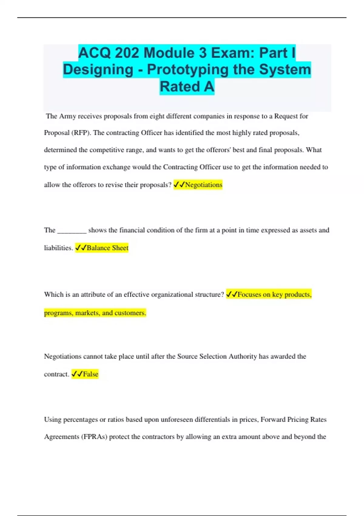 ACQ 202 Module 3 Exam: Part I Designing - Prototyping the System Rated A The Army receives proposals from eight different companies in response to a Request for Proposal (RFP). The contracting Officer has identified the most highly rated proposals, determined the competitive range, and wants to get the offerors' best and final proposals. What type of information exchange would the Contracting Officer use to get the information needed to allow the offerors to revise their proposals? Negotiations The ________ shows the financial condition of the firm at a point in time expressed as assets and liabilities. Balance Sheet Which is an attribute of an effective organizational structure? Focuses on key products, programs, markets, and customers. Negotiations cannot take place until after the Source Selection Authority has awarded the contract. False Using percentages or ratios based upon unforeseen differentials in prices, Forward Pricing Rates Agreements (FPRAs) protect the contractors by allowing an extra amount above and beyond the estimated quoted prices. Which of the following is NOT an example of an FPRA rate? Rates of corporate outings Engineering expenses attributable solely to a contract are an example of _____. Direct labor costs Which of the following is something you should NOT do during negotiations? Reach agreements on how to perform tasks. During source selection, evaluators reviewing the proposals and compiling their questions for individual offerors is commonly referred to as _____. Fact finding For a contract cost to be considered "allowable," it must be consistent with Government Cost Accounting Standards, Generally Accepted Accounting Principles, the terms of the contract ,and the Federal Acquisition Regulation (FAR). It must also be reasonable and: Which is more likely to decentralize staff functions, dedicating them to each business or product organization? Larger companies To implement a company's business strategy, an effective organizational structure will: Support the company's vision The costs included in a contract must be evaluated to determine whether they are allowable. During this process, the Government and the contractor can agree that a certain costs will be considered unallowable. True During source selection, you are evaluating a proposal and you have some questions for the offeror. What should you do? Convey your questions to the contracting officer to send to the offeror