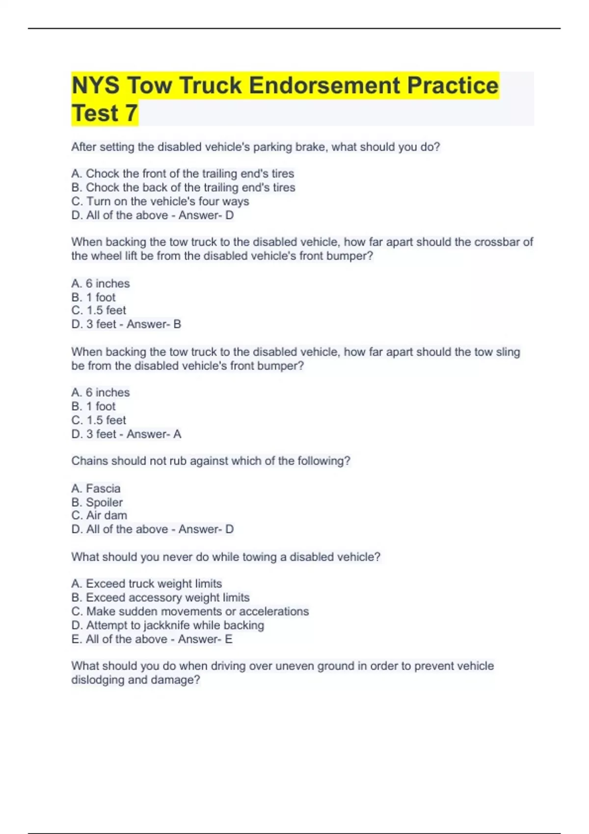 After setting the disabled vehicle's parking brake, what should you do? A. Chock the front of the trailing end's tires B. Chock the back of the trailing end's tires C. Turn on the vehicle's four ways D. All of the above - Answer- D When backing the tow truck to the disabled vehicle, how far apart should the crossbar of the wheel lift be from the disabled vehicle's front bumper? A. 6 inches B. 1 foot C. 1.5 feet D. 3 feet - Answer- B When backing the tow truck to the disabled vehicle, how far apart should the tow sling be from the disabled vehicle's front bumper? A. 6 inches B. 1 foot C. 1.5 feet D. 3 feet - Answer- A Chains should not rub against which of the following? A. Fascia B. Spoiler C. Air dam D. All of the above - Answer- D What should you never do while towing a disabled vehicle? A. Exceed truck weight limits B. Exceed accessory weight limits C. Make sudden movements or accelerations D. Attempt to jackknife while backing E. All of the above - Answer- E What should you do when driving over uneven ground in order to prevent vehicle dislodging and damage? A. Stop, then proceed slowly B. Proceed slowly throughout C. Keep the wheels straight and maintain the speed limit D. Find a different route - Answer- B While driving a tow truck with a disabled vehicle, what should you be frequently checking and why? A. Mirrors, to ensure proper vehicle tracking B. The wheel lift/tow sling, to ensure it's position has not changed C. Wheel securing straps, to ensure they stay tight D. The disabled vehicle, to ensure it has not shifted E. All of the above - Answer- E Why should you mark the drive shaft before removing it? A. For insurance purposes B. So mechanics don't forget to reattach it C. In case it falls off during tow D. It is needed in order reattach the drive shaft in the balanced position - Answer- D Why is it better to remove the drive shaft than the axle shafts for a tow? A. It is easier B. It minimizes the loss of lubricating fluid C. It allows for longer distance tows D. All of the above - Answer- D If you are towing a vehicle with a GVWR of over 7,000 pounds, what towing equipment is forbidden to use? A. Tow sling & T-hooks B. Tow sling & J-hooks C. Tow sling & dollies D. Work lights - Answer- B Removing the drive shaft from the driveline is sometimes the most dangerous part of a tow. What MUST you do to prevent possible death and injury? A. Put the disabled vehicle in neutral B. Release the disabled vehicles brakes C. Both A and B D. Neither A nor B - Answer- C If you are towing a disabled vehicle that is having differential problems, what should you do? A. Remove the drive axles B. Install axle covers C. Ensure the disabled vehicle is completely turned off D. All of the above - Answer- D What do axle covers do? A. Cover/protect drive axle shaft openings to prevent contamination or loss of wheel bearing lubrication B. Create better airflow around the rims C. Connects the drive shaft to the drive line D. Connects the axle shafts to the drive line - Answer- A Why must a disabled vehicles engine be shut off completely for a tow? A. Electronic devices on the towed vehicle might cause a brake lock-up B. Truck transmissions are not properly lubricated for towing C. It is a fire hazard D. It is a waste of possibly needed fuel - Answer- A What is the minimum distance allowable from the lowest drive axles of a disabled vehicle to the ground? A. 6 inches B. 10 inches C. 12 inches D. 18 inches - Answer- B What are bed locks? A. Fixture extending below the tilt bed of a car carrier that makes contact with the ground prior to full extension B. The V or Y type coupling device used to attach and center a cable C. Interlock brakes that activate once the bed of a car carrier is tilted D. Devices that secure the carrier bed in place during travel - Answer- D When you are loading/unloading a disabled vehicle with a car carrier, what should you be looking for? A. Traffic around you B. Emergency service vehicles C. Leftover debris from where the car is moved from D. The ground clearance of the vehicle - Answer- D
