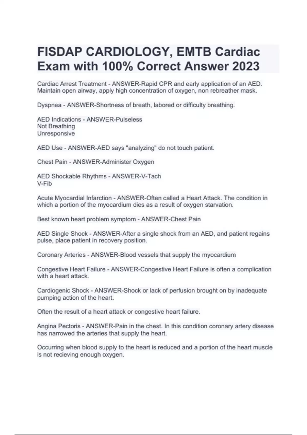 FISDAP CARDIOLOGY, EMTB Cardiac Exam with 100% Correct Answer 2023. Cardiac Arrest Treatment - ANSWER-Rapid CPR and early application of an AED. Maintain open airway, apply high concentration of oxygen, non rebreather mask. Dyspnea - ANSWER-Shortness of breath, labored or difficulty breathing. AED Indications - ANSWER-Pulseless Not Breathing Unresponsive AED Use - ANSWER-AED says "analyzing" do not touch patient. Chest Pain - ANSWER-Administer Oxygen AED Shockable Rhythms - ANSWER-V-Tach V-Fib Acute Myocardial Infarction - ANSWER-Often called a Heart Attack. The condition in which a portion of the myocardium dies as a result of oxygen starvation. Best known heart problem symptom - ANSWER-Chest Pain AED Single Shock - ANSWER-After a single shock from an AED, and patient regains pulse, place patient in recovery position. Coronary Arteries - ANSWER-Blood vessels that supply the myocardium Congestive Heart Failure - ANSWER-Congestive Heart Failure is often a complication with a heart attack. Cardiogenic Shock - ANSWER-Shock or lack of perfusion brought on by inadequate pumping action of the heart. Often the result of a heart attack or congestive heart failure. Angina Pectoris - ANSWER-Pain in the chest. In this condition coronary artery disease has narrowed the arteries that supply the heart. Occurring when blood supply to the heart is reduced and a portion of the heart muscle is not recieving enough oxygen. Coronary Artery Disease - ANSWER-Conditions that narrow or block the arteries of the heart. Coronary artery disease is often the result of buildup of fatty deposits on the inner walls of the arteries. Right Sided Heart Failure - ANSWER-Pedal Edema Identify Stroke - ANSWER-Cincinnati Prehospital Stroke Scale Facial Droop Arm Drift Slurred Speech Altered Mental Status Hypoperfusion - ANSWER-Also known as shock. Inability of the body to adequately circulate blood to the body's cells to supply them with oxygen. Nitroglycerin - ANSWER-Taken by patient's who have chest pain of cardiac origin. Dilates the blood vessels Left Ventricle - ANSWER-Pumps oxygenated blood to the body. Coronary Artery Diseases - ANSWER-Angina Pectoris Acute Myocardial Infarction Congestive Heart Failure Left Sided Heart Failure - ANSWER-Pulmonary Edema Anatomy of the Heart - ANSWER-Right Atrium to Right Ventricle Left Atrium to Left Ventricle Artery - ANSWER-Carries blood away from the heart Viens - ANSWER-Carry blood to the heart Cardiac Medications - ANSWER-Nitroglycerin Aspirin Cardiac Dysrrhythmia - ANSWER-Irregular heartbeat. Improper beating of the heart, too fast or too slow Storke Assessment - ANSWER-Facial Assessment Ask patient to grimace to smile.