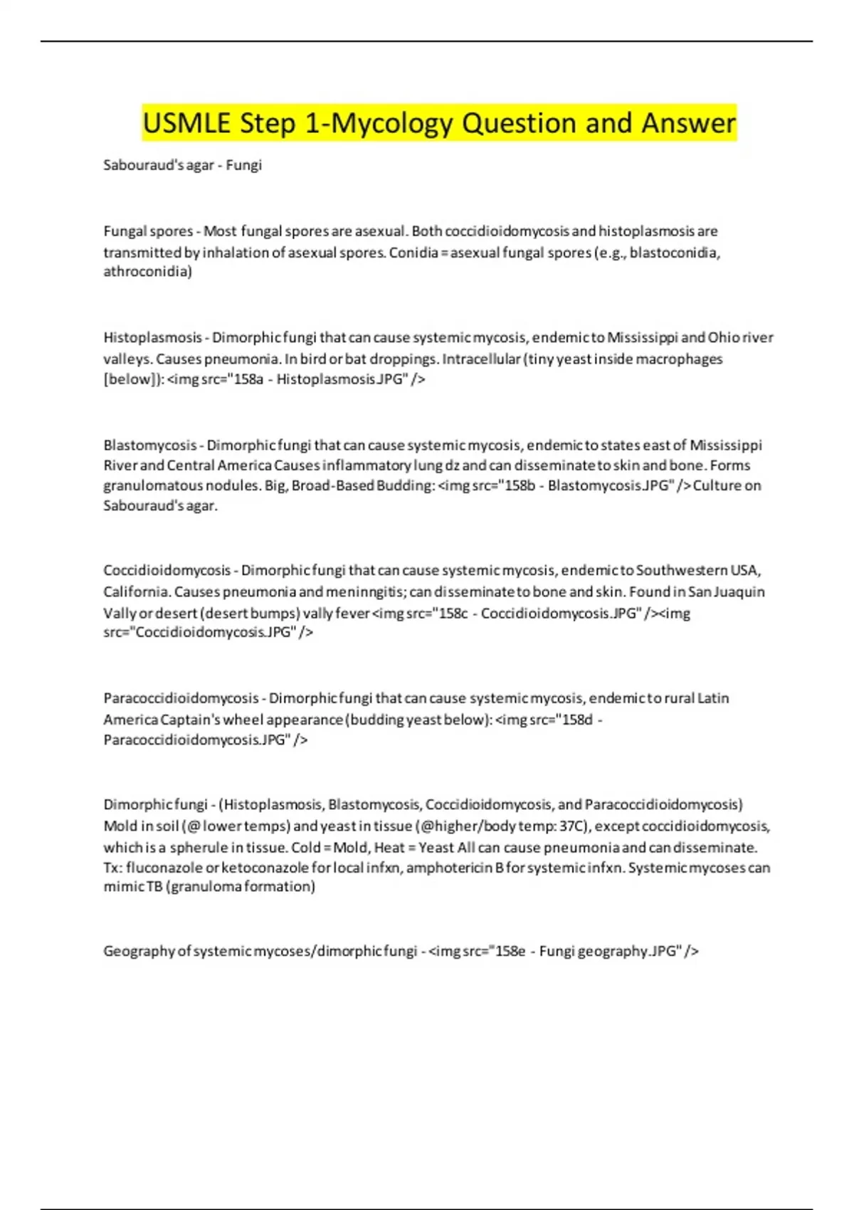 Sabouraud's agar - Fungi Fungal spores - Most fungal spores are asexual. Both coccidioidomycosis and histoplasmosis are transmitted by inhalation of asexual spores. Conidia = asexual fungal spores (e.g., blastoconidia, athroconidia) Histoplasmosis - Dimorphic fungi that can cause systemic mycosis, endemic to Mississippi and Ohio river valleys. Causes pneumonia. In bird or bat droppings. Intracellular (tiny yeast inside macrophages [below]): img src="158a - Histoplasmosis.JPG" / Blastomycosis - Dimorphic fungi that can cause systemic mycosis, endemic to states east of Mississippi River and Central America Causes inflammatory lung dz and can disseminate to skin and bone. Forms granulomatous nodules. Big, Broad-Based Budding: img src="158b - Blastomycosis.JPG" / Culture on Sabouraud's agar. Coccidioidomycosis - Dimorphic fungi that can cause systemic mycosis, endemic to Southwestern USA, California. Causes pneumonia and meninngitis; can disseminate to bone and skin. Found in San Juaquin Vally or desert (desert bumps) vally fever img src="158c - Coccidioidomycosis.JPG" /img src="Coccidioidomycosis.JPG" / Paracoccidioidomycosis - Dimorphic fungi that can cause systemic mycosis, endemic to rural Latin America Captain's wheel appearance (budding yeast below): img src="158d - Paracoccidioidomycosis.JPG" / Dimorphic fungi - (Histoplasmosis, Blastomycosis, Coccidioidomycosis, and Paracoccidioidomycosis) Mold in soil (@ lower temps) and yeast in tissue (@higher/body temp: 37C), except coccidioidomycosis, which is a spherule in tissue. Cold = Mold, Heat = Yeast All can cause pneumonia and can disseminate. Tx: fluconazole or ketoconazole for local infxn, amphotericin B for systemic infxn. Systemic mycoses can mimic TB (granuloma formation) Geography of systemic mycoses/dimorphic fungi - img src="158e - Fungi geography.JPG" / Tinea versicolor img src="159a - Tinea versicolor.JPG" / - Caused by Malassezia furfur. Occurs in hot, humid weather. Tx: topical miconazole, selenium sulfide (Selsun). Spaghetti and meatballs appearance on KOH prep.