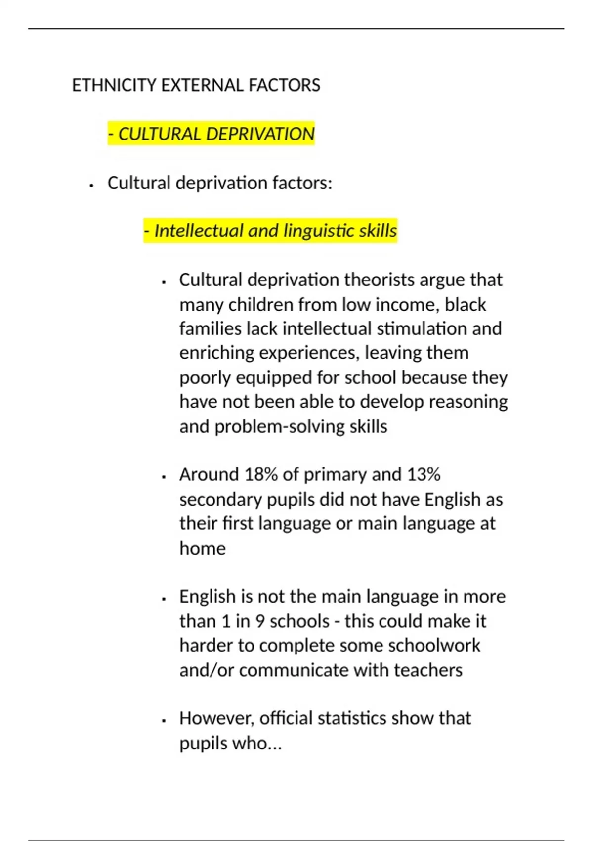 Summary A Level AQA Sociology- Education (Ethnicity external factors)