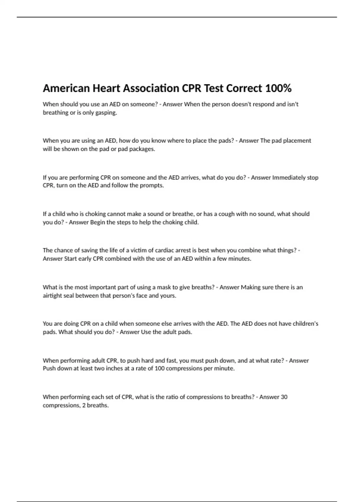 American Heart Association CPR Test Correct 100%