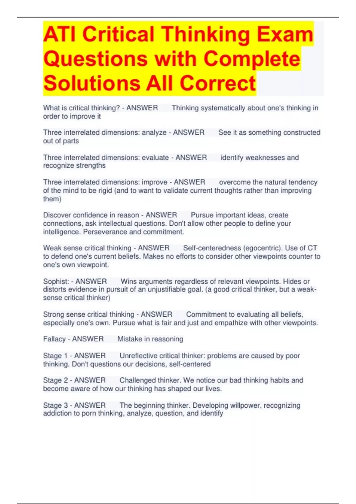 ATI Critical Thinking Exam Questions with Complete Solutions All Correct What is critical thinking? - ANSWER Thinking systematically about one's thinking in order to improve it Three interrelated dimensions: analyze - ANSWER See it as something constructed out of parts Three interrelated dimensions: evaluate - ANSWER identify weaknesses and recognize strengths Three interrelated dimensions: improve - ANSWER overcome the natural tendency of the mind to be rigid (and to want to validate current thoughts rather than improving them) Discover confidence in reason - ANSWER Pursue important ideas, create connections, ask intellectual questions. Don't allow other people to define your intelligence. Perseverance and commitment. Weak sense critical thinking - ANSWER Self-centeredness (egocentric). Use of CT to defend one's current beliefs. Makes no efforts to consider other viewpoints counter to one's own viewpoint. Sophist: - ANSWER Wins arguments regardless of relevant viewpoints. Hides or distorts evidence in pursuit of an unjustifiable goal. (a good critical thinker, but a weak-sense critical thinker) Strong sense critical thinking - ANSWER Commitment to evaluating all beliefs, especially one's own. Pursue what is fair and just and empathize with other viewpoints. Fallacy - ANSWER Mistake in reasoning Stage 1 - ANSWER Unreflective critical thinker: problems are caused by poor thinking. Don't questions our decisions, self-centered Stage 2 - ANSWER Challenged thinker. We notice our bad thinking habits and become aware of how our thinking has shaped our lives. Stage 3 - ANSWER The beginning thinker. Developing willpower, recognizing addiction to porn thinking, analyze, question, and identify Critical thinking tactics - ANSWER Use wasted time, handle a problem a day, internalize intellectual standards (focus), keep an intellectual journal (emotional significance), practice intellectual strategies, reshape your character (one trait at a time), deal with your ego, redefine the way you see things (mistakes versus opportunities), get in touch with your emotions (negative thinking), analyze group influences on your life Three basic functions of the mind - ANSWER Thinking (create meaning, make sense of event), feeling (evaluate those meanings, positive and negative), wanting (allocate energy into action) Dogmatic absolutism - ANSWER Non-intellectual faith (A thinking trap that frees us of any actual responsibility) Second order thinking - ANSWER Another term for critical thinking Critical thinking values ______ of thought over _____ of thought - ANSWER Critical thinking values depth of thought over speed of thought Fair-mindedness - ANSWER Bringing an unbiased perspective to all relevant viewpoints Intellectual humility - ANSWER Develop knowledge of the extent of my ignorance. Being aware of my biases and prejudices and the limitations of my viewpoint Intellectual humility (opposite of) - ANSWER Intellectual arrogance: thinking we know more than we actually do. No insight of my own self deception or the limitations of my point of view How does intellectual humility relate to fair-mindedness? - ANSWER Knowledge of our ignorance can improve our thinking and recognize prejudices, false beliefs, and habits of mind that lead to flawed learning Intellectual courage - ANSWER Facing and fairly addressing ideas, beliefs, or viewpoints even when it is painful. Intellectual courage (opposite of) - ANSWER Intellectual cowardice: the fear of ideas that do not conform to my own. Afraid to give serious consideration to ideas or viewpoints that I think are dangerous. We have a linked our beliefs to our identity. How does intellectual courage relate to fair-mindedness? - ANSWER When we disconnect our beliefs from identity, we become intellectually courageous and follow evidence and reason wherever they lead. This makes us more fair-minded.