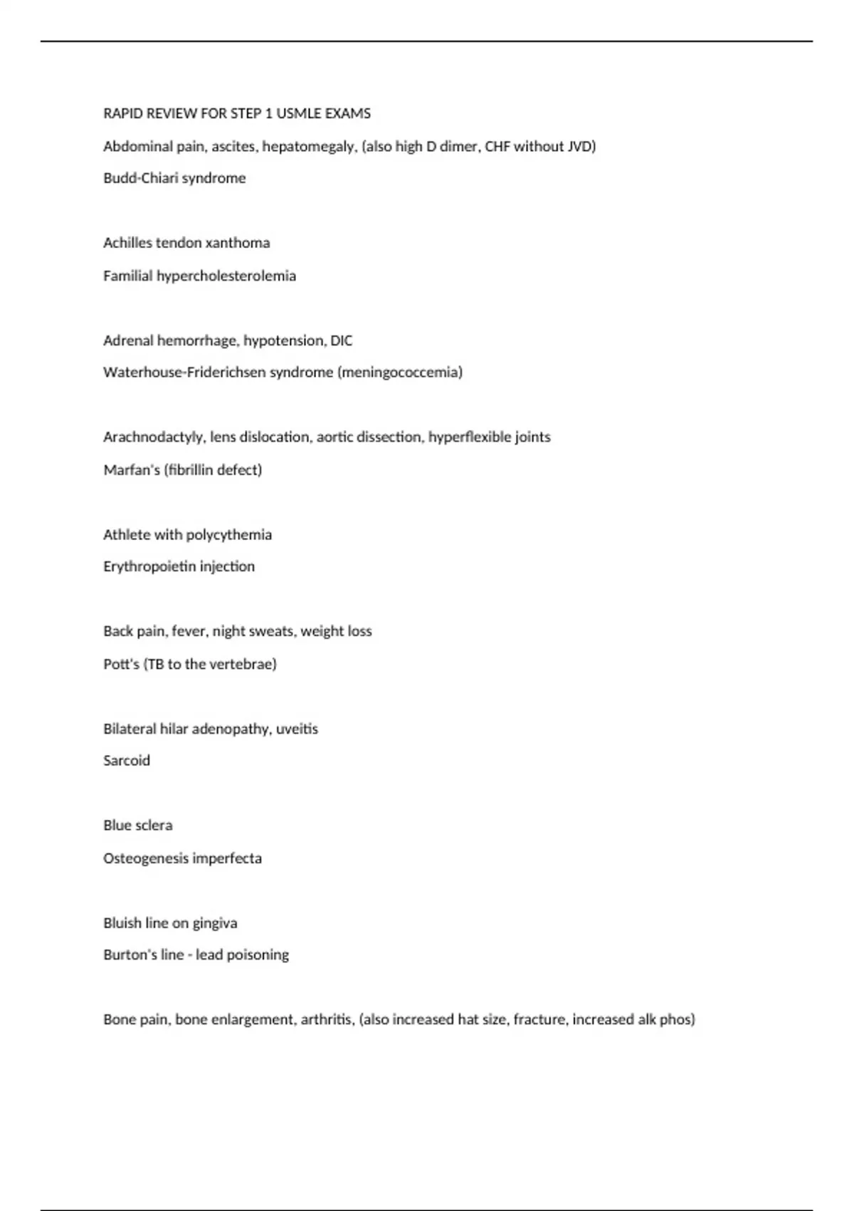 Abdominal pain, ascites, hepatomegaly, (also high D dimer, CHF without JVD) Budd-Chiari syndrome Achilles tendon xanthoma Familial hypercholesterolemia Adrenal hemorrhage, hypotension, DIC Waterhouse-Friderichsen syndrome (meningococcemia) Arachnodactyly, lens dislocation, aortic dissection, hyperflexible joints Marfan's (fibrillin defect) Athlete with polycythemia Erythropoietin injection Back pain, fever, night sweats, weight loss Pott's (TB to the vertebrae) Bilateral hilar adenopathy, uveitis Sarcoid Blue sclera Osteogenesis imperfecta Bluish line on gingiva Burton's line - lead poisoning Bone pain, bone enlargement, arthritis, (also increased hat size, fracture, increased alk phos) Paget's Bounding pulses, diastolic hear murmur, head bobbing Aortic regurg Café-au-lait spots, Lisch nodules NF (1 = optic glimoas and pheo, 2 = acoustic Schwannomas) Café-au-lait spots, polyostotic fibrous dysplasia, precocious puberty McCune-Albright syndome (G protein problem) Calf pseudohypertrophy Duchenne's muscular dystrophy