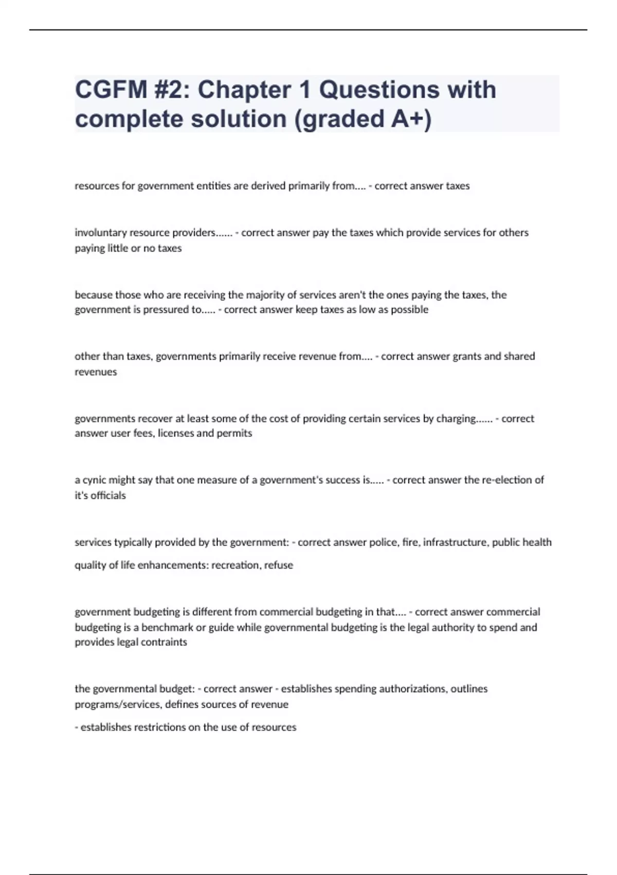 CGFM #2: Chapter 1 Questions with complete solution (graded A+)resources for government entities are derived primarily from.... - correct answer taxes involuntary resource providers...... - correct answer pay the taxes which provide services for others paying little or no taxes because those who are receiving the majority of services aren't the ones paying the taxes, the government is pressured to..... - correct answer keep taxes as low as possible other than taxes, governments primarily receive revenue from.... - correct answer grants and shared revenues governments recover at least some of the cost of providing certain services by charging...... - correct answer user fees, licenses and permits a cynic might say that one measure of a government's success is..... - correct answer the re-election of it's officials services typically provided by the government: - correct answer police, fire, infrastructure, public health quality of life enhancements: recreation, refuse government budgeting is different from commercial budgeting in that.... - correct answer commercial budgeting is a benchmark or guide while governmental budgeting is the legal authority to spend and provides legal contraints the governmental budget: - correct answer - establishes spending authorizations, outlines programs/services, defines sources of revenue - establishes restrictions on the use of resources