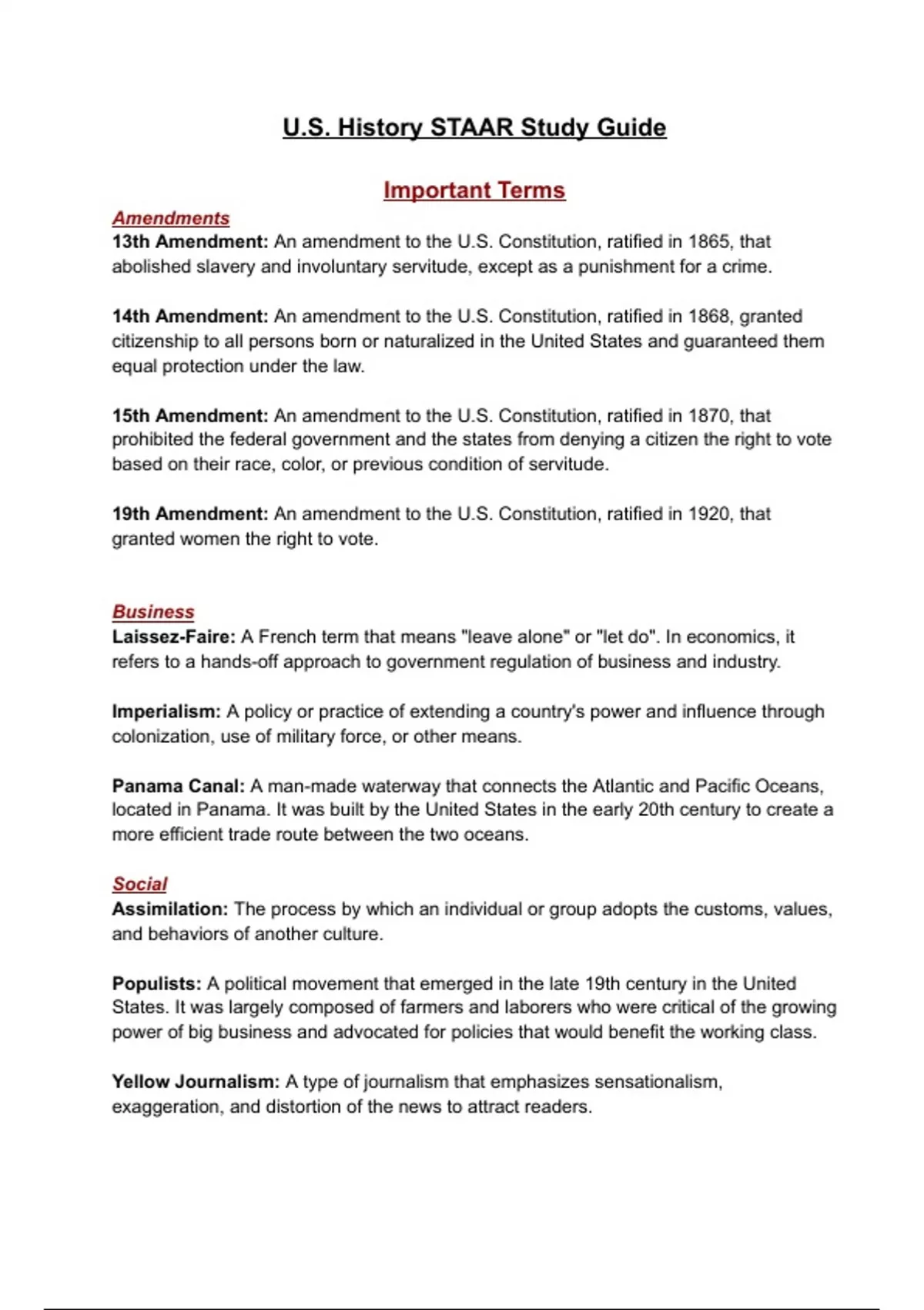 U.S. History STAAR Study Guide/Test Review