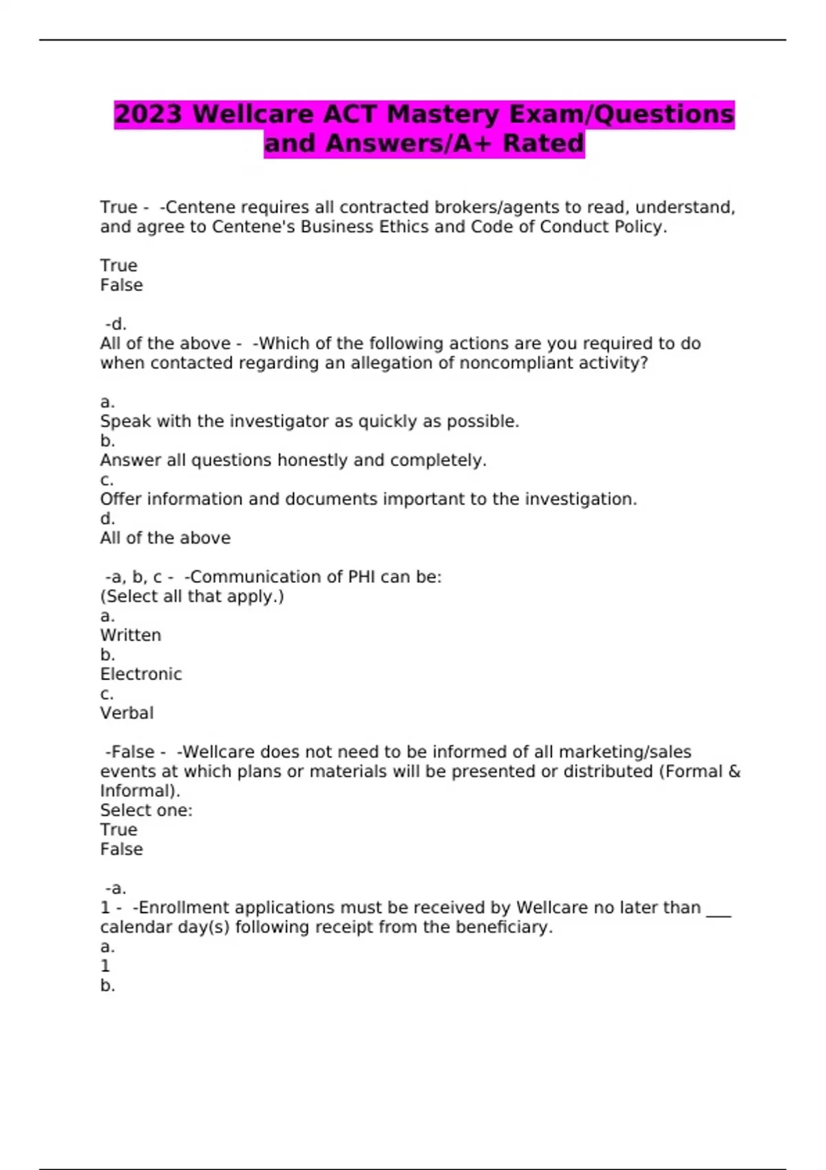 2023 Wellcare ACT Mastery Exam/Questions and Answers/A+ Rated