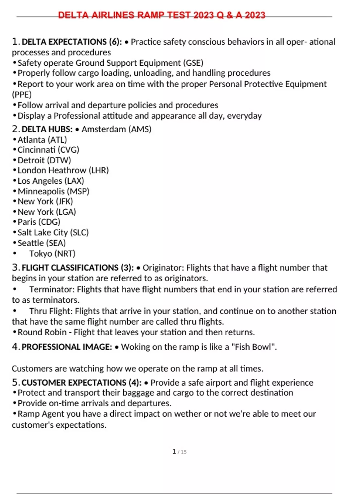 1. DELTA EXPECTATIONS (6): • Practice safety conscious behaviors in all oper- ational processes and procedures • Safety operate Ground Support Equipment (GSE) • Properly follow cargo loading, unloading, and handling procedures • Report to your work area on time with the proper Personal Protective Equipment (PPE) • Follow arrival and departure policies and procedures • Display a Professional attitude and appearance all day, everyday 2. DELTA HUBS: • Amsterdam (AMS) • Atlanta (ATL) • Cincinnati (CVG) • Detroit (DTW) • London Heathrow (LHR) • Los Angeles (LAX) • Minneapolis (MSP) • New York (JFK) • New York (LGA) • Paris (CDG) • Salt Lake City (SLC) • Seattle (SEA) • Tokyo (NRT) 3. FLIGHT CLASSIFICATIONS (3): • Originator: Flights that have a flight number that begins in your station are referred to as originators. • Terminator: Flights that have flight numbers that end in your station are referred to as terminators. • Thru Flight: Flights that arrive in your station, and continue on to another station that have the same flight number are called thru flights. • Round Robin - Flight that leaves your station and then returns. 4. PROFESSIONAL IMAGE: • Woking on the ramp is like a "Fish Bowl". Customers are watching how we operate on the ramp at all times. 5. CUSTOMER EXPECTATIONS (4): • Provide a safe airport and flight experience • Protect and transport their baggage and cargo to the correct destination • Provide on-time arrivals and departures. • Ramp Agent you have a direct impact on wether or not we're able to meet our customer's expectations. 6. CELL PHONE POLICY (4): • Personal phones or pager are restricted to autho- rized break areas during appropriate break times. • Either device should be worn out of site when clothing allows and keep on silent in public contract areas. • Messages receive should be returned on personal time. • Delta Authorized phones can be used in the operations as long as you are at minimum 10 feet from the fuel point and not operations motorized equipment. 7. SEVERE WEATHER AWARENESS (4): • Sudden wind gusts • Sudden temperature drop • Thunder • Dark clouds 8. SEVERE WEATHER PRECAUTIONS (3): • Use the telephone only in an emer- gency • Seek cover inside a building • Note: Do not seek shelter under an aircraft or an open vehicle/tug! 9. SYMPTOMS OF HEAT EXHAUSTION (13): • Headache • Heavy sweating • Intense thrust • Dizziness • Fatigue • Loss of coordination • Nausea • Impaired judgment • Loss of appetite • Hyperventilation • Tingling in the hands and feet • Anxiety • Moist clammy skin 10. SYMPTOMS OF HEAT STROKE: • High body temperature (103 F) • Distinct absence of sweating • Hot dry skin • Rapid pulse • Difficulty breathing • Constricted pupils • Any or all signs of heat exhaustion, but more severe • Bizarre behavior • High blood pressure