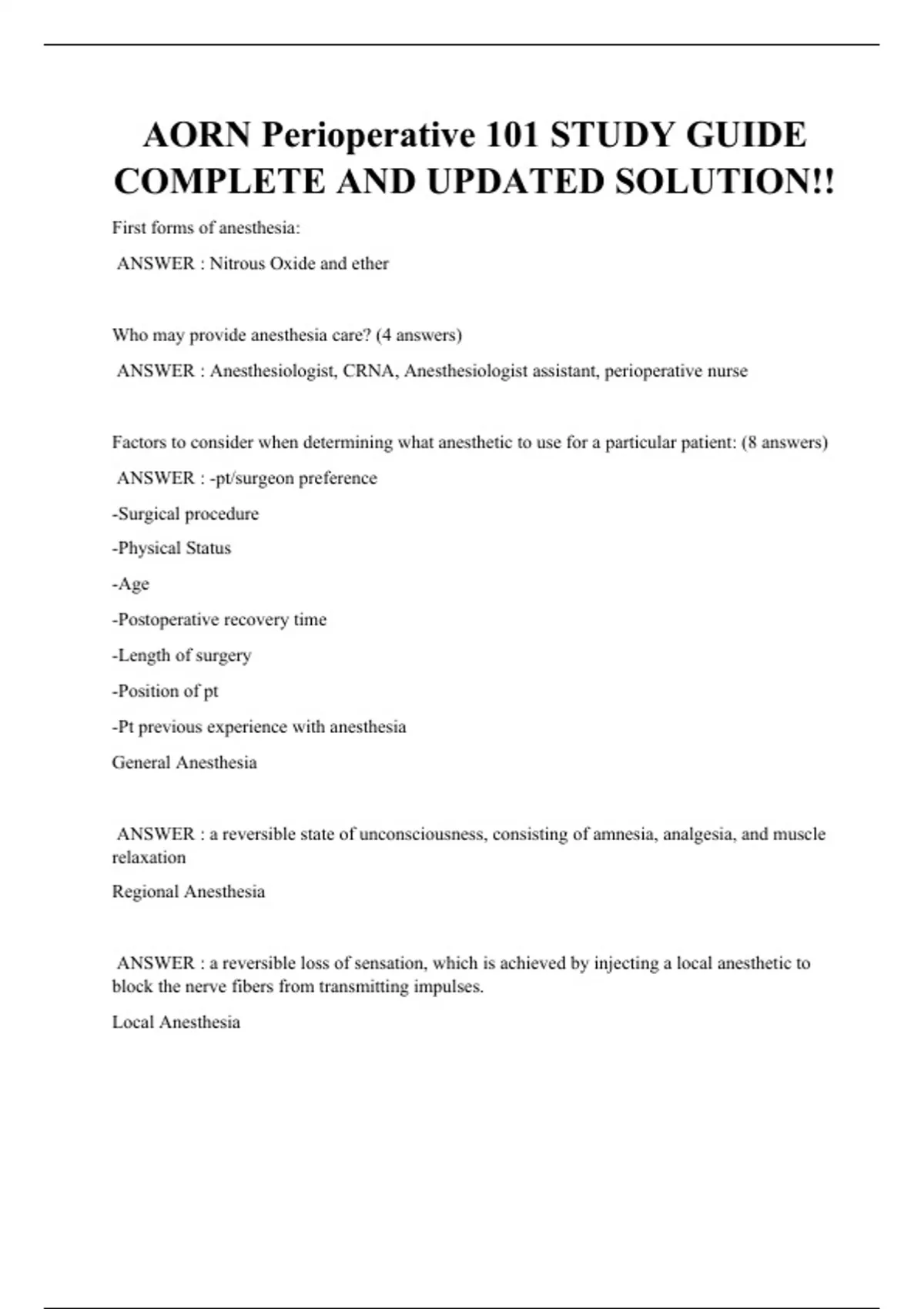 AORN Perioperative 101 STUDY GUIDE COMPLETE AND UPDATED SOLUTION!! First forms of anesthesia: ANSWER : Nitrous Oxide and ether Who may provide anesthesia care? (4 answers) ANSWER : Anesthesiologist, CRNA, Anesthesiologist assistant, perioperative nurse Factors to consider when determining what anesthetic to use for a particular patient: (8 answers) ANSWER : -pt/surgeon preference -Surgical procedure -Physical Status -Age -Postoperative recovery time