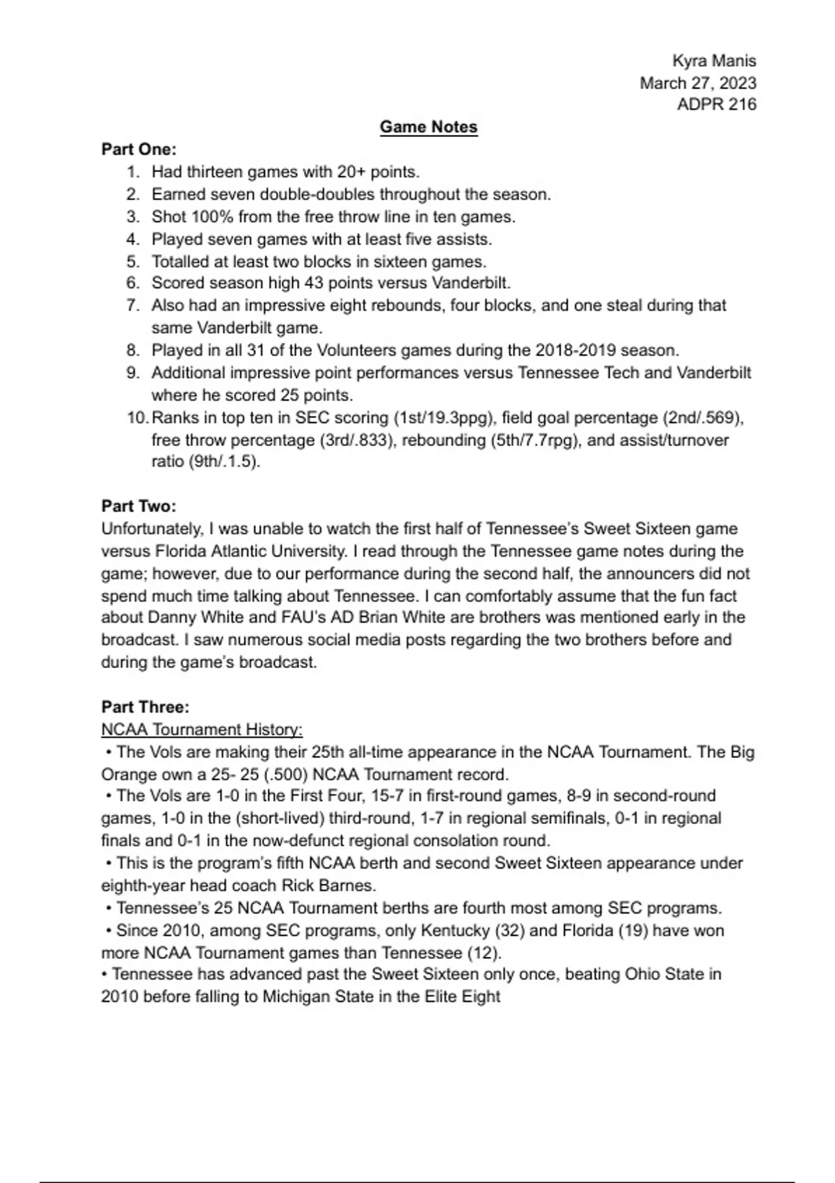 This is an online assignment you are asked to complete during the semester. You are asked to write game notes about a past UTK basketball game.