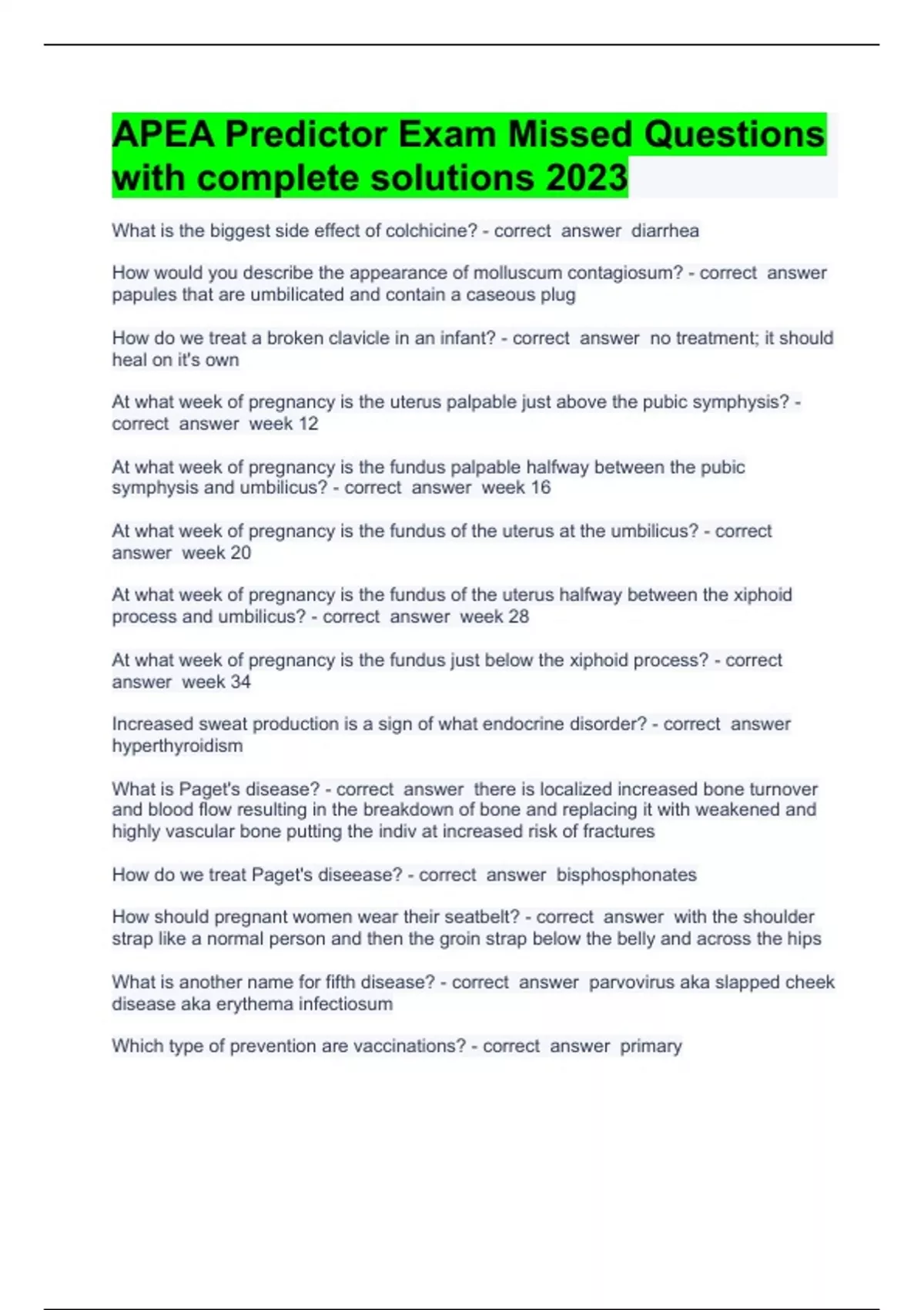APEA Predictor Exam Missed Questions with complete solutions 2023What is the biggest side effect of colchicine? diarrhea How would you describe the appearance of molluscum contagiosum? papules that are umbilicated and contain a caseous plug How do we treat a broken clavicle in an infant? no treatment; it should heal on it's own At what week of pregnancy is the uterus palpable just above the pubic symphysis? week 12 At what week of pregnancy is the fundus palpable halfway between the pubic symphysis and umbilicus? week 16 At what week of pregnancy is the fundus of the uterus at the umbilicus? week 20 At what week of pregnancy is the fundus of the uterus halfway between the xiphoid process and umbilicus? week 28 At what week of pregnancy is the fundus just below the xiphoid process? week 34 Increased sweat production is a sign of what endocrine disorder? hyperthyroidism What is Paget's disease? there is localized increased bone turnover and blood flow resulting in the breakdown of bone and replacing it with weakened and highly vascular bone putting the indiv at increased risk of fractures How do we treat Paget's diseease? bisphosphonates How should pregnant women wear their seatbelt? with the shoulder strap like a normal person and then the groin strap below the belly and across the hips What is another name for fifth disease? parvovirus aka slapped cheek disease aka erythema infectiosum Which type of prevention are vaccinations? primary